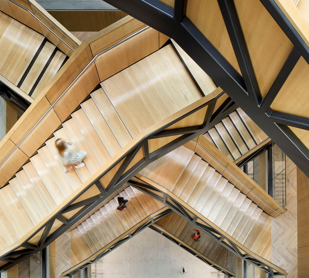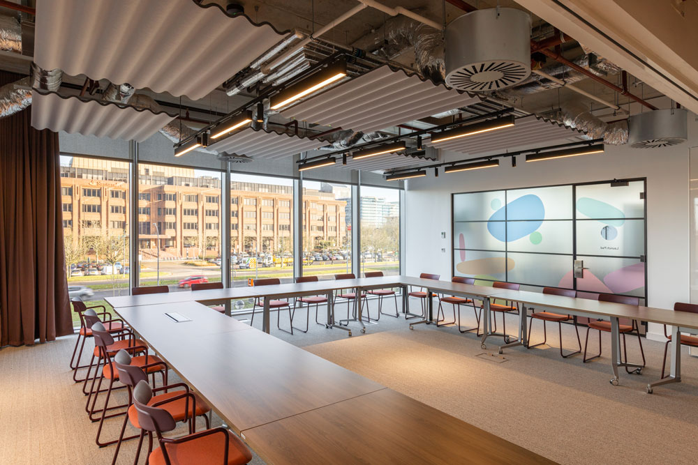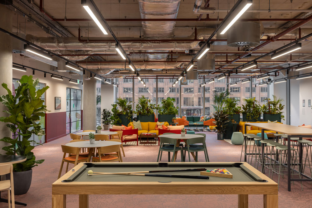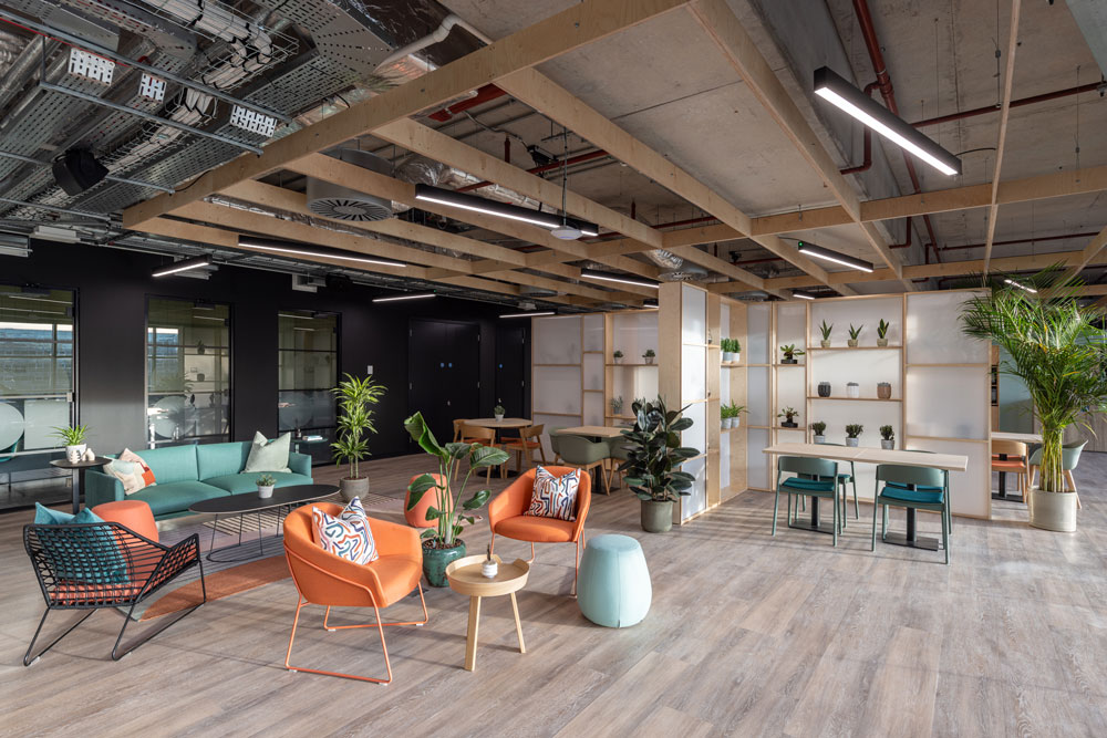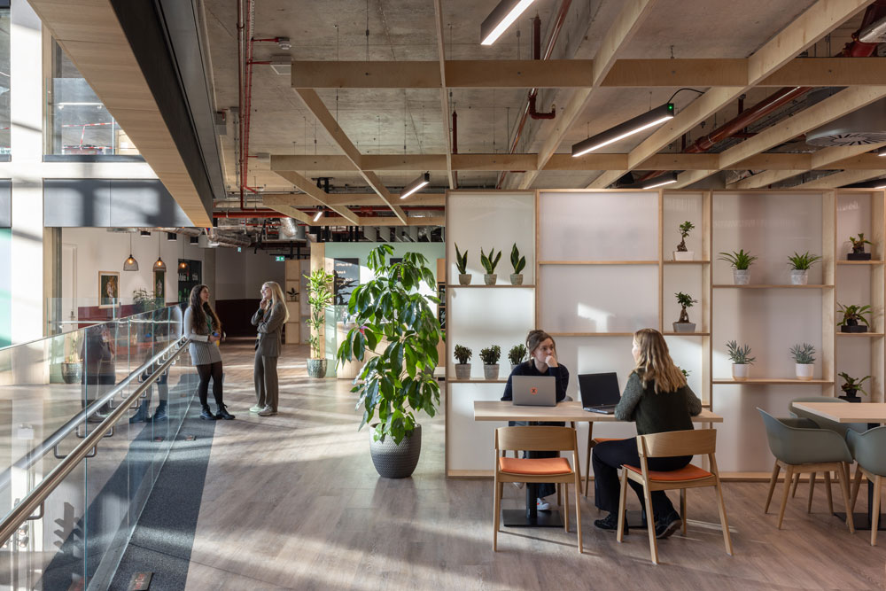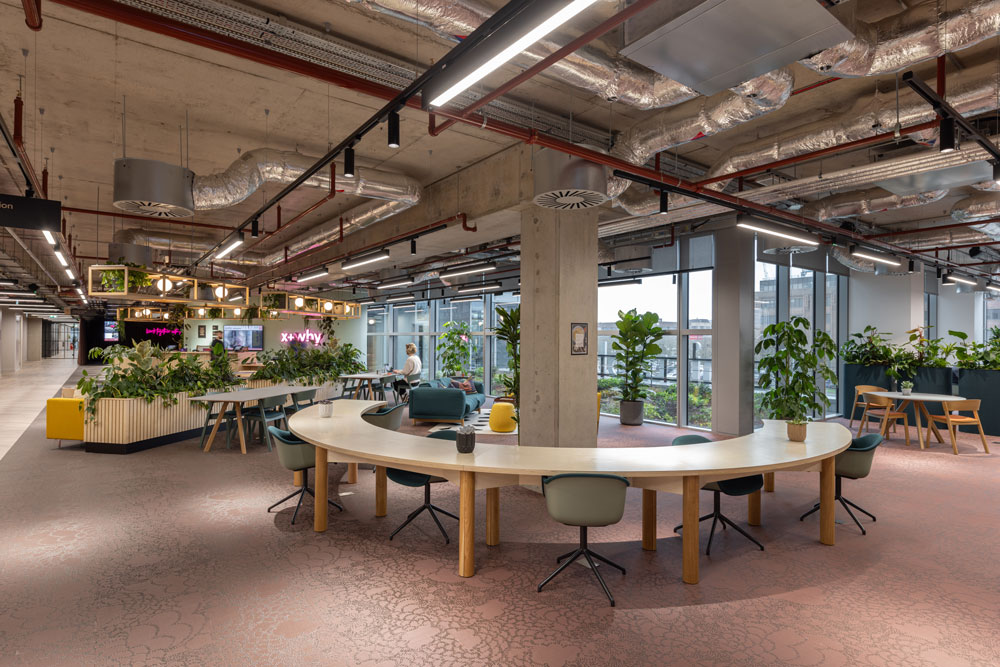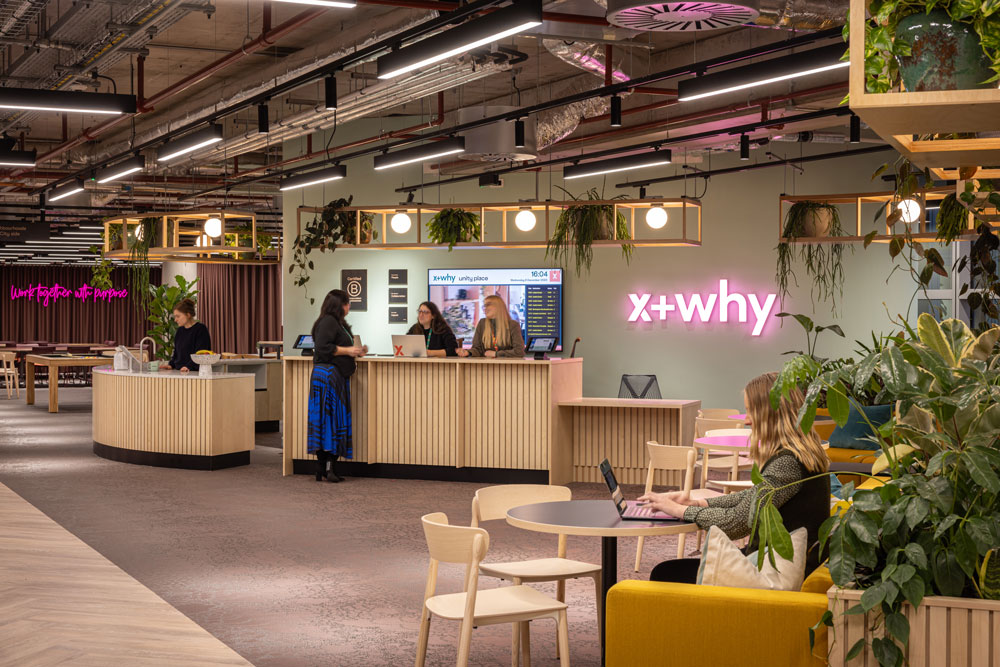 Taking design cues from the region’s urban planning heritage and modernist architecture, the geometric blocks of Unity Place are both separated and connected by green atria, and landscaped terraces to mirror the city’s grid structure. The seven levels encompass four floors for Santander employees, one flexible working floor, the 6,500 sqm coworking floor operated by x+why and the Milton Keynes University and Santander learning floor for local students. Ranging from single occupants to Enterprise Suites for up to 90, x+why’s coworking space can accommodate 1,200 members and was designed with digital start-ups and local creatives in mind.