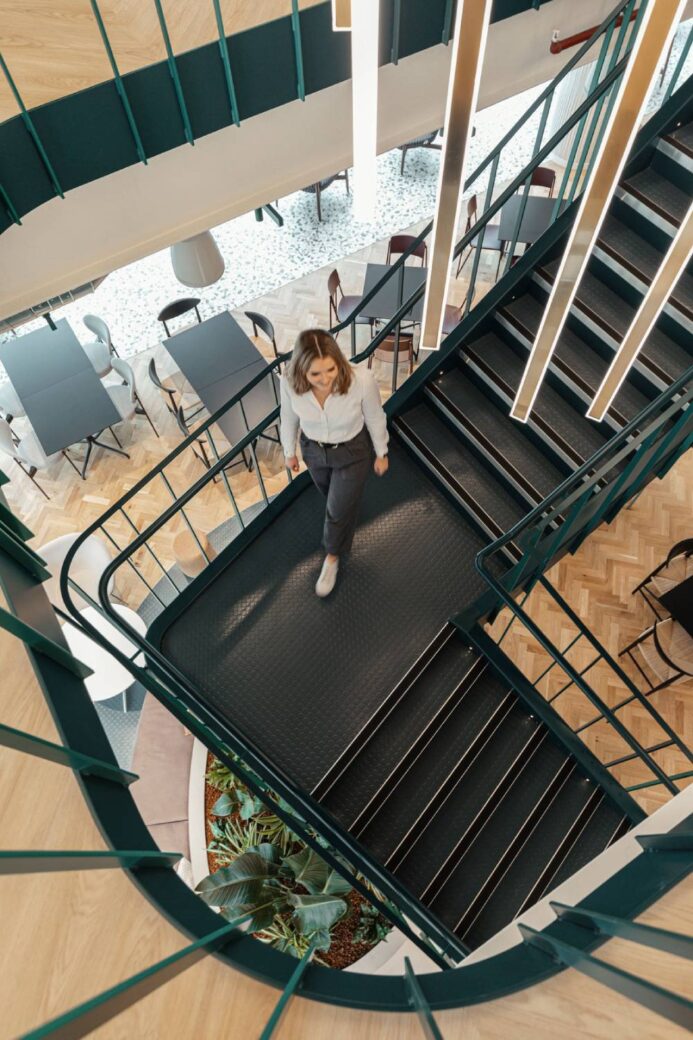 As cultural integration was a key focus of the project, the central staircase acts as a focal point in the building to encourage movement and interaction between the two units. Practically, these stairs also provide access to shared amenities such as the work lounge and terrace, promoting equality across each department.