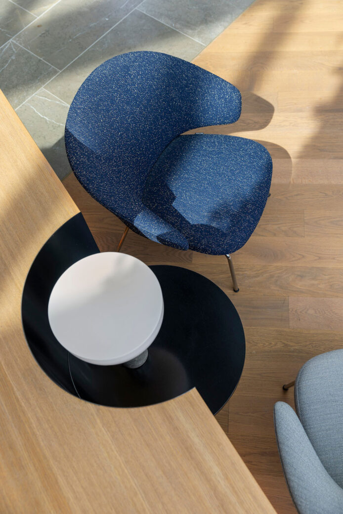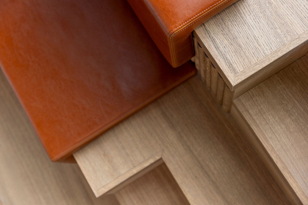 Carefully carved into the timber expanse, an array of seating configurations accommodates the various needs of users, offering places to dwell, work, wait and meet. These range from more secluded seating in the lower part facing the glass façade to benches around embedded communal tables and tribune seating on the highest part of the block, which offers a vantage point over the full atrium.