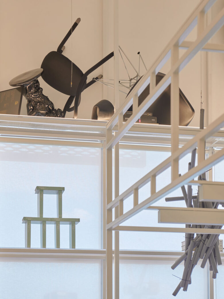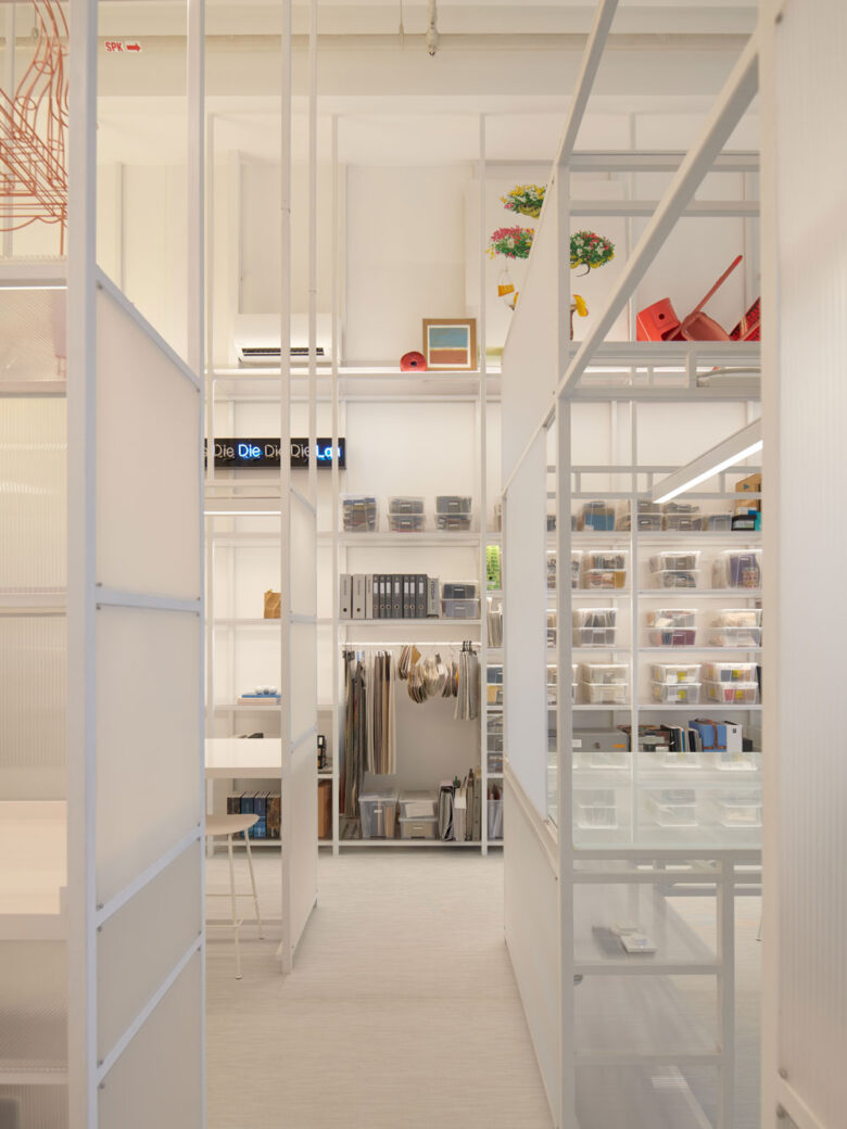 Through a series of interlocking, three-dimensional metal scaffolding, the workshop is split into distinctive zones without feeling siloed or blocking the flow of natural light from its generous south and west facing windows. Keeping the workspaces flexible and agile, frosted polycarbonate and fluted glass screens not only contribute to a bright, contemporary feel, but can also be flipped into a horizontal plane and used for storage, display and occasional worktops when needed. Centred around a ‘war room’ table, staff can freely engage in creative collaboration and make use of an adjacent magnetic display wall, which is crafted from lengths of cable tray. This display wall enables a wide range of working styles and hands-on meetings, including material explorations, design discussions and formal presentations.