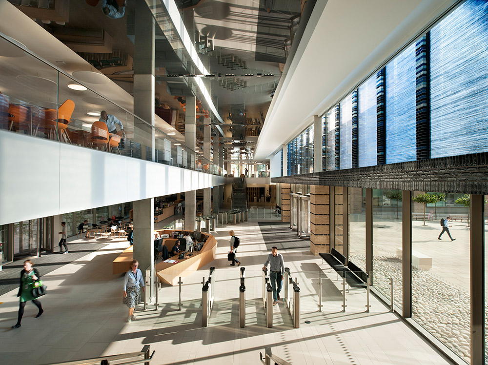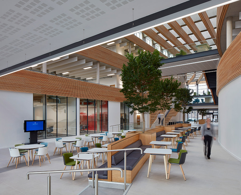 UKHO’s new headquarters is designed to meet the needs of one of the world’s leading geospatial information companies. The brief was to encourage a ‘one team’ culture. The design has accomplished this with generous staircases, open balconies and wide bridges, creating physical and visual connections throughout the building.