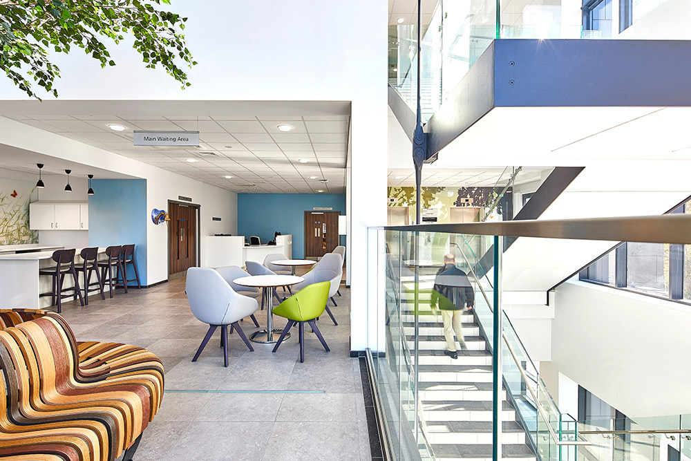 Last year BDP completed a new facility for the Royal National Orthopaedic Hospital. A central glazed atrium provides a focal point and a clearly defined entrance in the wider hospital grounds and the interior design concept takes reference from the landscape, trees and nature of the surrounding area.