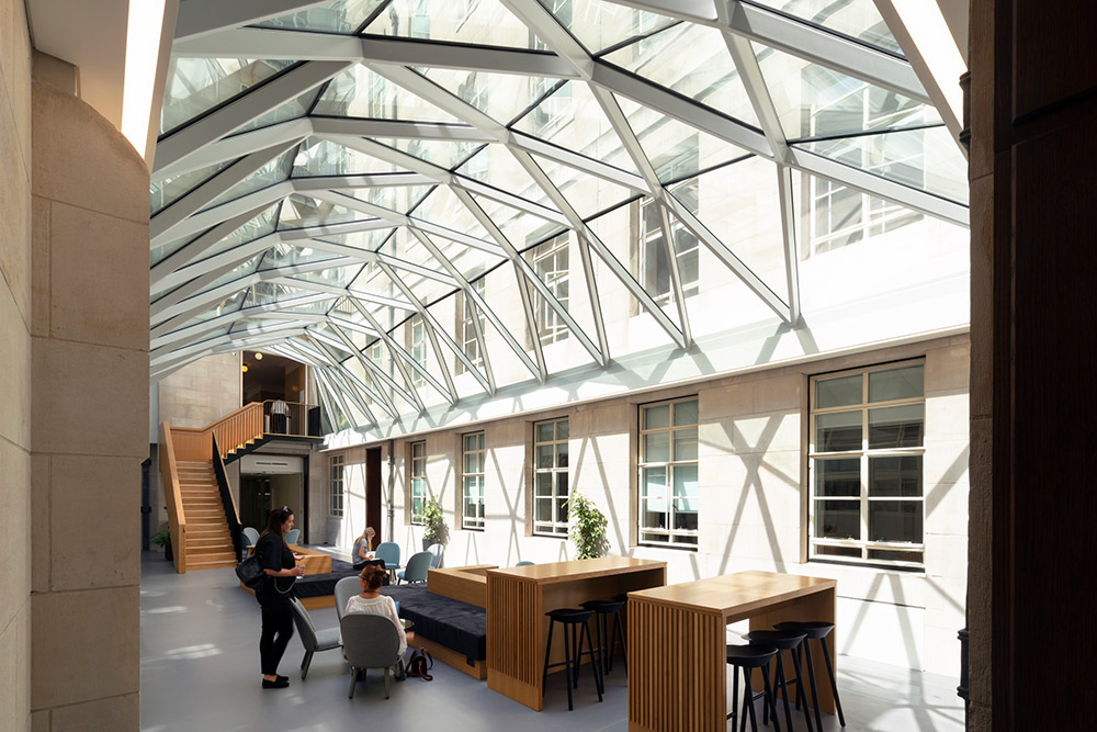 Spacelab have completely transformed the lower ground floor of the University of London’s historic Senate House, consolidating over 250 staff into one space. Previously only used for storage, the lower ground floor is now a light and buzzing workspace that seamlessly marries the building’s rich history with modern interventions.