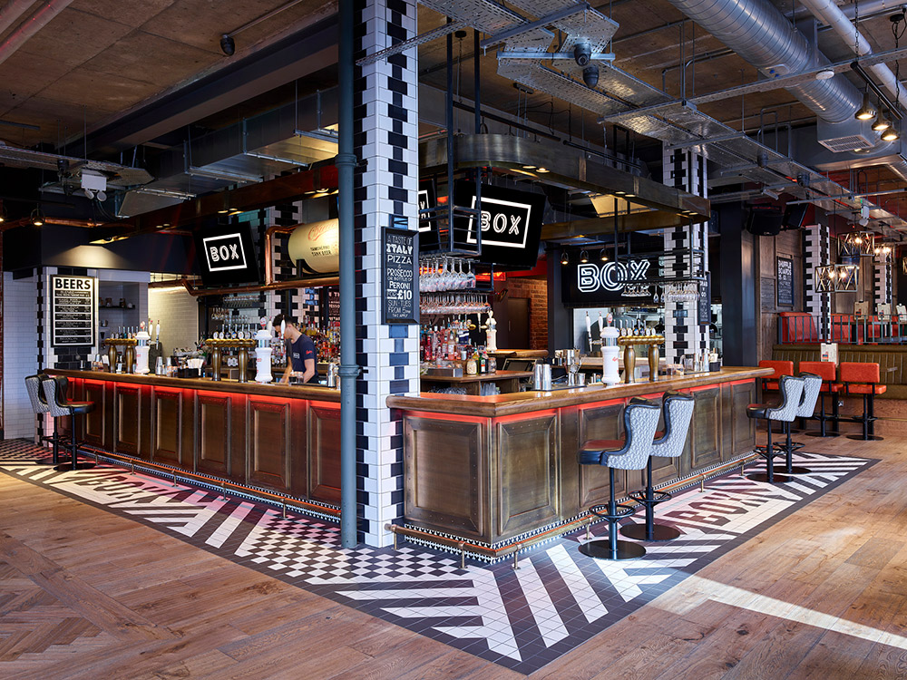 The Box takes the successful brand from the suburbs of Headingley into Leeds city centre and features interior design provided by Fusion by Design. Based in the Financial District, the concept is based around a sports bar, with key feature elements that broaden its appeal for all day drinking and dining.