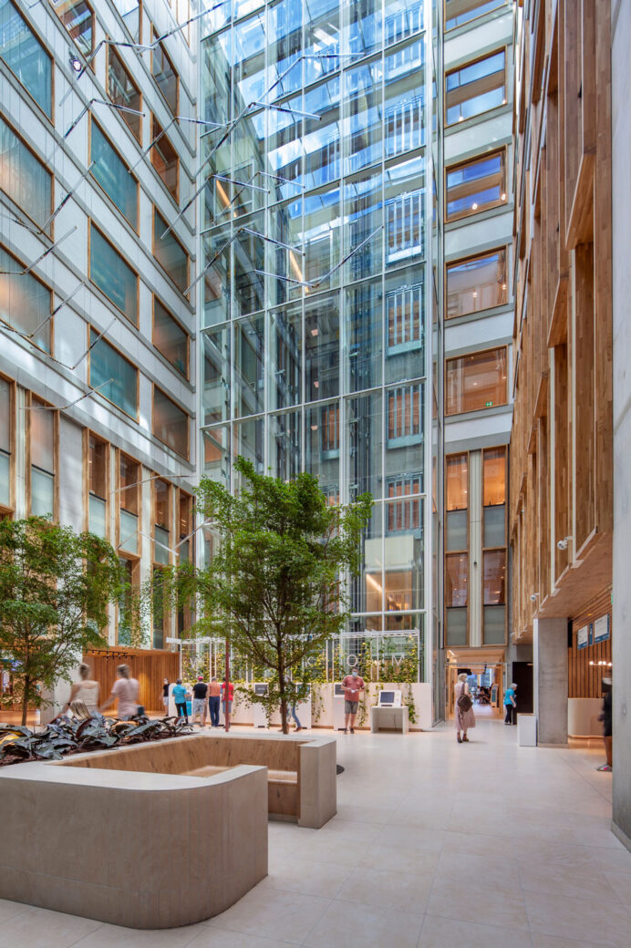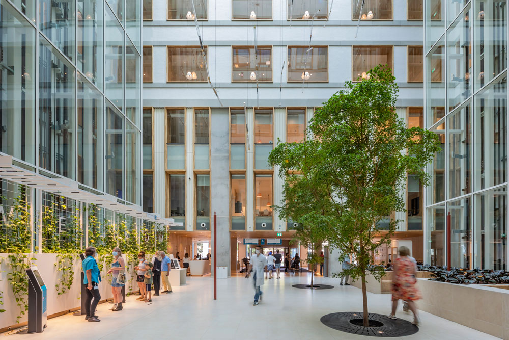 Recognising the importance of working and recovering in natural light (to support the body’s natural biorhythm as well as our physical and mental health), natural light and verdant plants take centre stage, enabled by an abundance of large windows. Nowhere is this appreciation for the great outdoors more evident than the seven-floor-tall central atrium, where sunlight and views of the courtyard gardens brighten the welcoming communal spaces on the ground floor. Here, a combination of outpatient clinics, reception areas and the hospital’s restaurant sit behind a glass façade that smoothly transitions into a glazed roof to offer year-round views of the sky above.