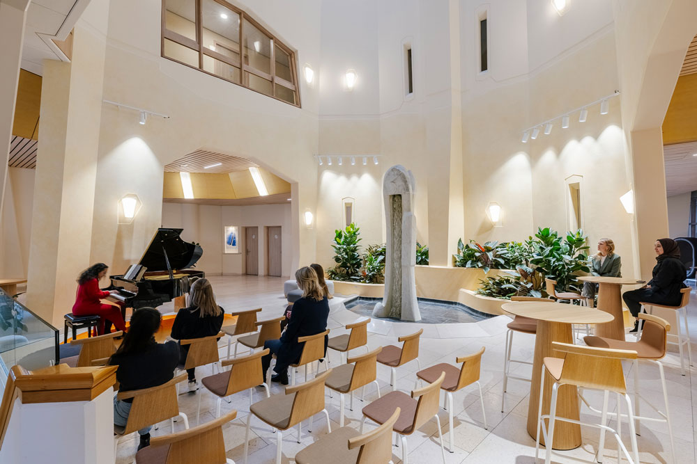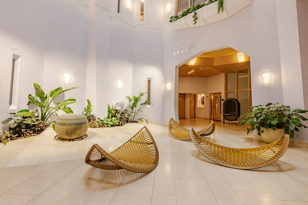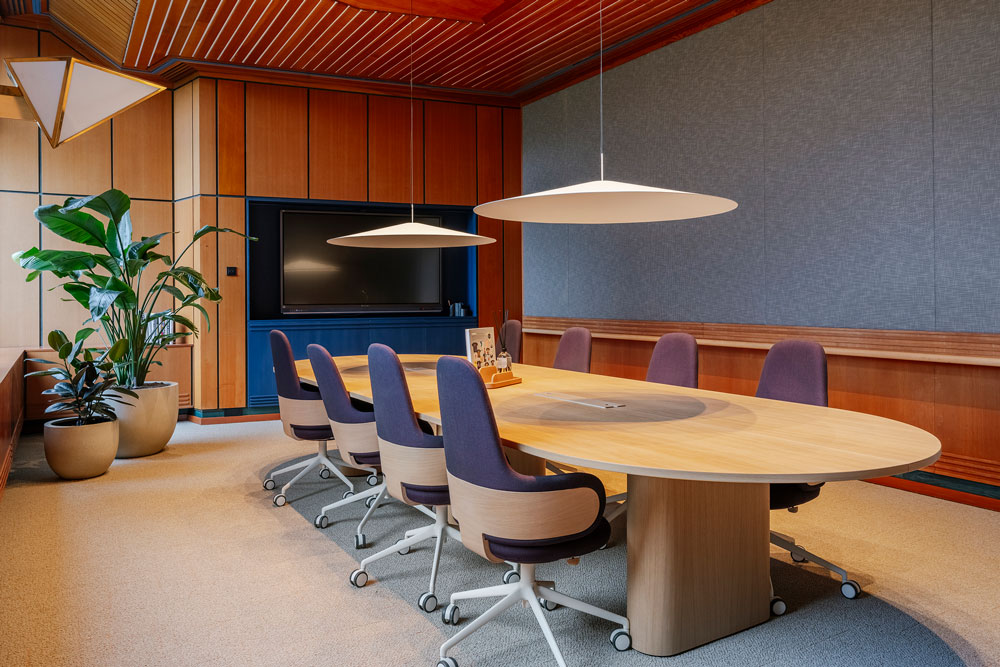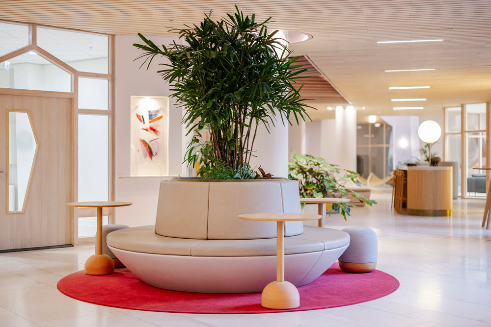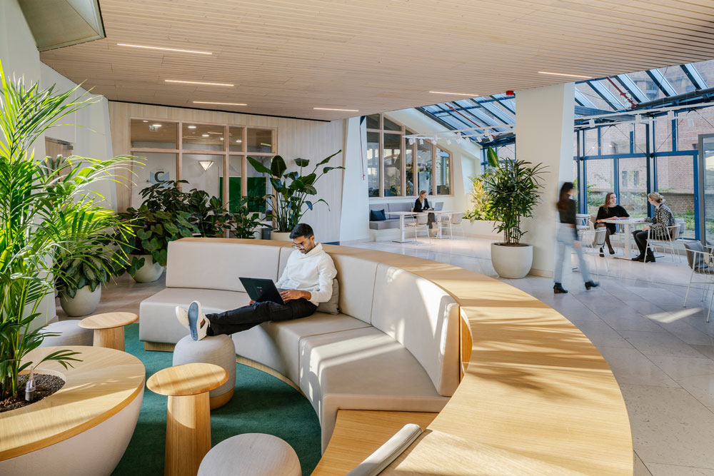 The in-house auditorium is an excellent example of the building’s dynamic culture: available for office tenants to host meetings or presentations, the space becomes a community cinema by night, while central atriums used for coworking double as music venues for local artists. The abundant natural greenery, already incorporated in the original design by Alberts & Van Huut, was also revisited by Amsterdam-based initiative MOSS (Makers of Sustainable Spaces), introducing new plants that match the colour palette of each specific area. Circular seating modules surround leafy, sprawling trees, helping to create the atmosphere of a serene, airy public park.