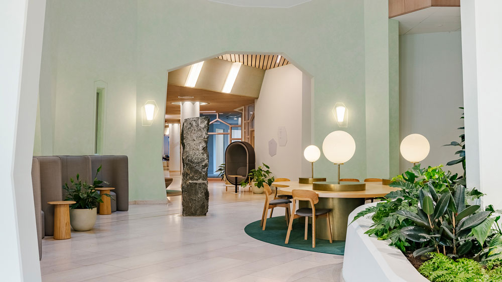 As well as core principles of biophilia and soft, undulating shapes, D/DOCK also followed the guiding concept of an ‘internal city’ during the redevelopment, incorporating spaces inspired by the city’s streets, squares and parks. A large corridor on the first-floor acts as the main artery of the building, connecting office and coworking spaces, meeting rooms and hospitality venues as well as inviting residents from the 263 apartments above, for a seamless blend of private and public spaces. Going beyond aesthetics, this internal city concept inspired an overall user-centric approach to the interiors, prioritising functionality, spatial awareness and adaptability wherever possible. This helped the studio navigate the building’s vast footprint, infusing human-centric elements in order to balance the imposing architecture with a sense of intimacy and accessibility.