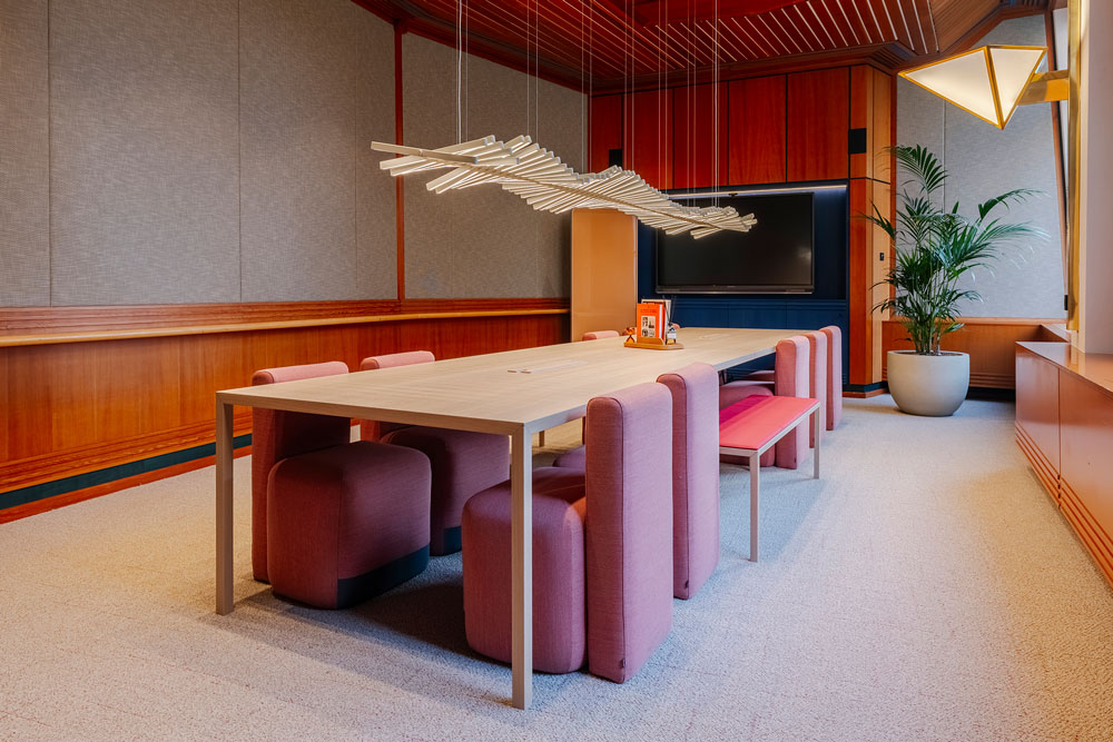 Not a 90-degree angle in sight, Zandkasteel is characterised by a free-form configuration and organic silhouettes, a purposeful departure from the uninspiring, angular cubicles typically associated with a conventional 1980s office block. This incorporation of loose, flexible elements was also informed by D/DOCK’s close collaboration with Max van Huut of Alberts & Van Huut Architecture, who originally designed Zandkasteel almost four decades ago. van Huut’s firm set the unique condition of avoiding any fixed items to the floors or walls, a decision that not only respects the building’s original character, but also serves as a lesson in future-proofing new projects with flexibility and modular elements built-in. This approach, combined with D/DOCK’s signature focus on community and sustainability, helped Zandkasteel earn the Geurt Brinkgreve Award for Best Heritage Redevelopment Project in 2023.