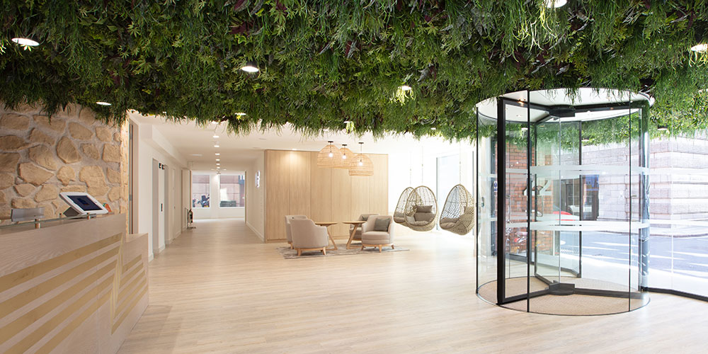 Upon entering, we’re struck by three things – firstly, how calm and tranquil it is, secondly, that there appears to be no Office Space in Town branding, and, thirdly, we can’t help but smile at the biophilic ‘green’ ceiling immediately above us. ‘The whole point of this building is to make you smile as much as possible, because work can be tough enough’ Roy begins, noting our faces when we see the ceiling above. ‘We did originally want this to be a ‘live’ feature, but watering it was a bit of an issue, so we have used plastic plants instead.