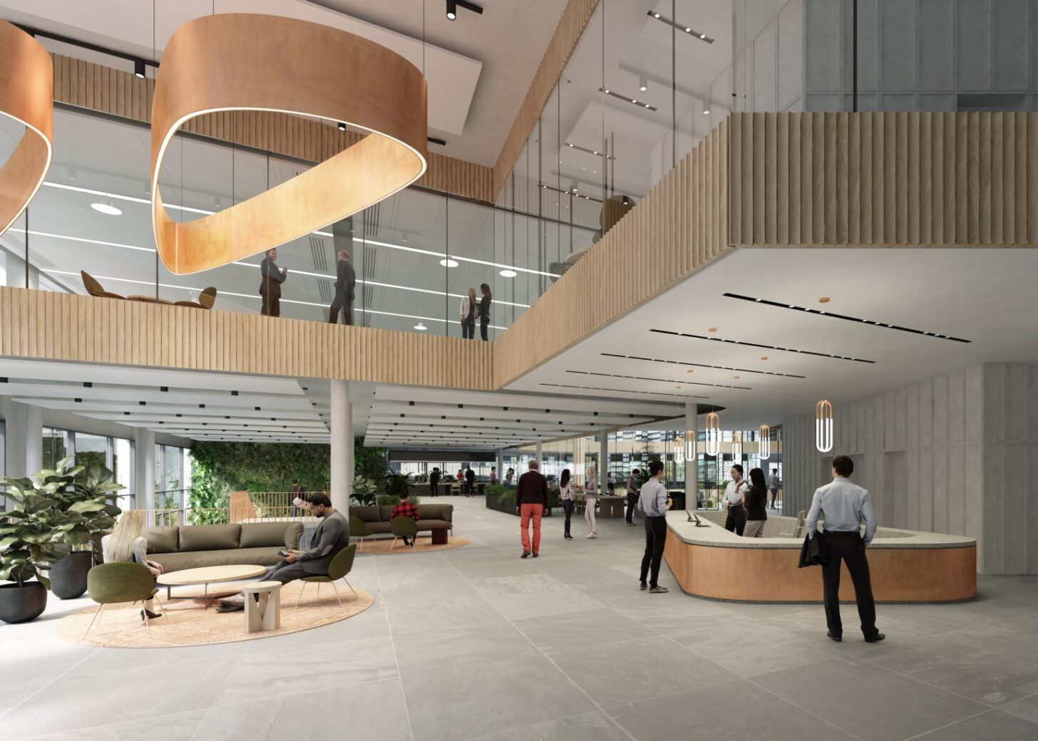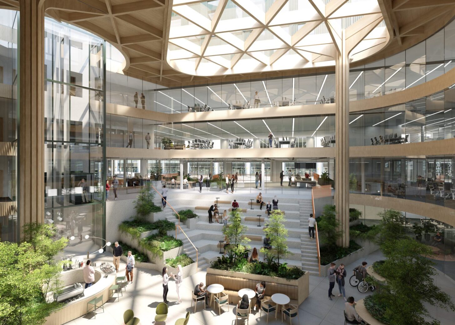 Architecture firm Sheppard Robson has set its sights on Calton Square, a city-centre office building originally designed by Allan Murray Architects in 2002. Proposals include remodelling the structure to increase its footprint by around 6,000 sqm, while retaining 88% of the existing frame in an adaptive reuse approach. The firm’s plans also respond to overheating issues caused by large portions of glazing, as well as a less than dynamic layout split along a central access: in its place, a triple-height atrium with a new timber roof would repurpose an under-loved internal courtyard, alongside a reception area with modern coworking, lounge and café spaces.