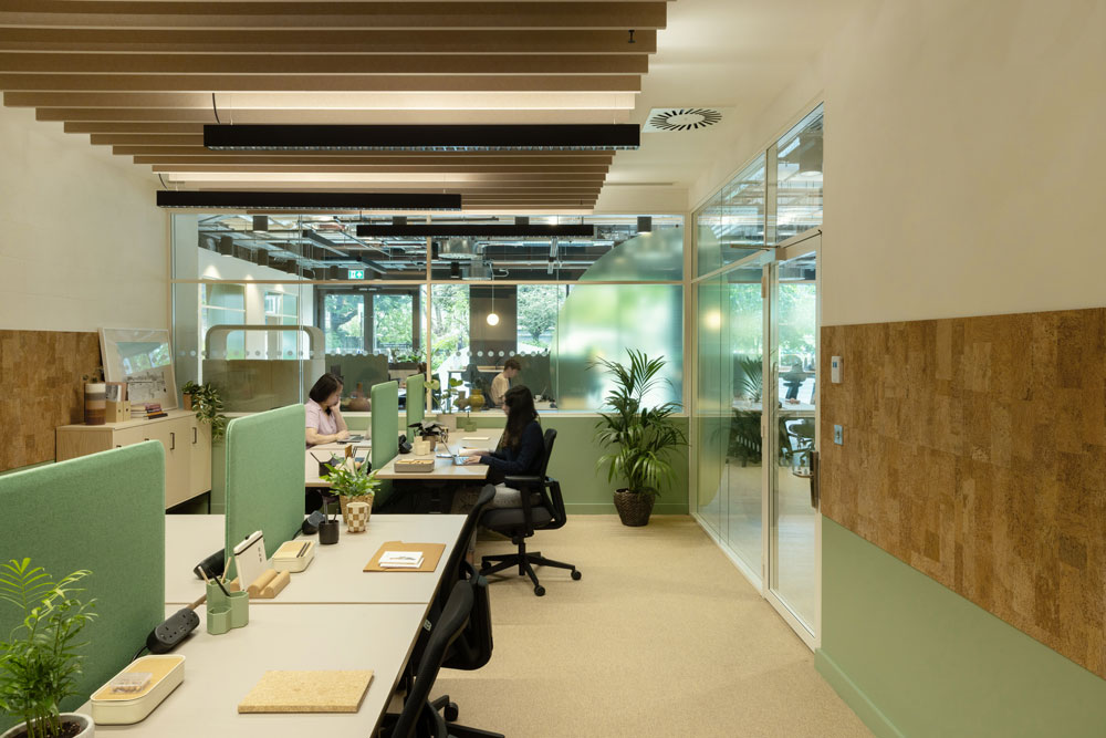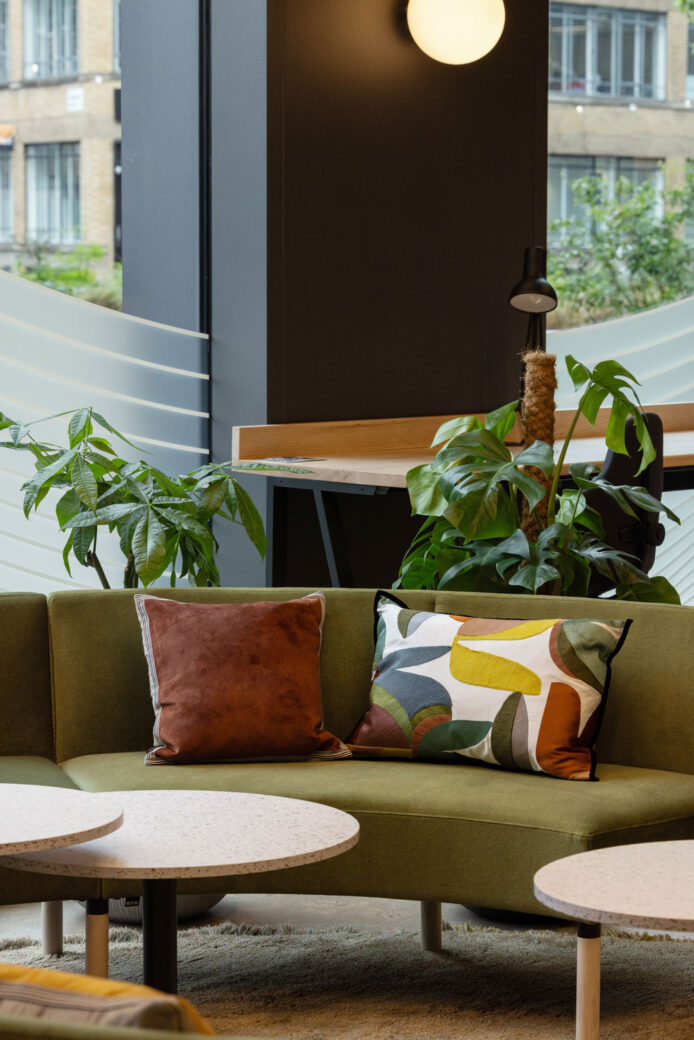 As well as nurturing a sense of community and inclusivity for Impact Hub’s members, Feix&Merlin also led with sustainability. The studio opted for a considered palette of natural materials including cork flooring, timber finishes and felt pendant lighting, all of which are complemented by an overarching scheme of nature-inspired hues such as green, terracotta and ash (the cork and felt finishes also offering acoustic absorption during busy periods). The hub additionally features reclaimed hardwood pieces from sustainable furniture initiative Think Found, natural cork flooring from Quadmod, and Planq kitchen worktops made with recycled army clothing.