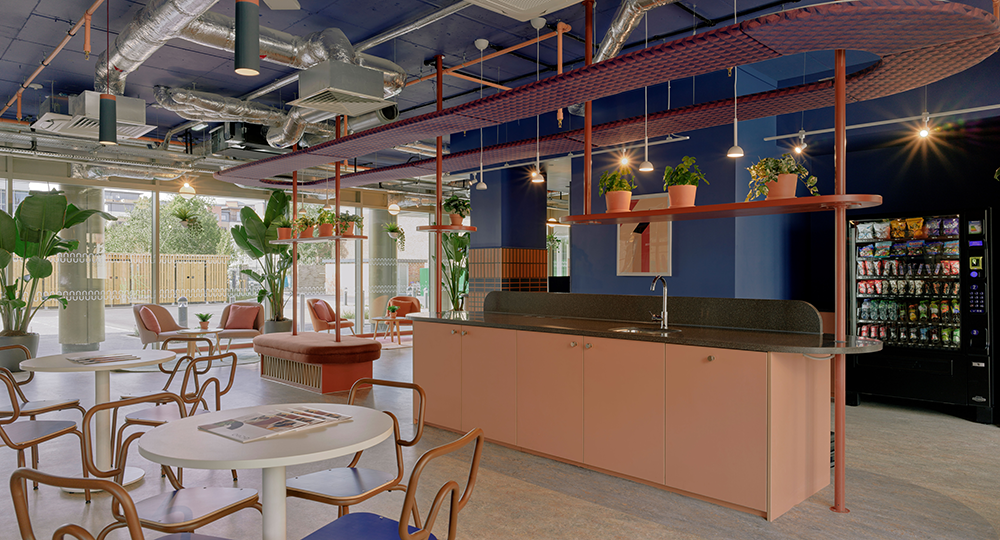 Enso’s distinctive colour palette also blends Roman-era references with local natural colours, celebrating warm, earthy tones. As Withey explains, “We emphasised the toasty burnt oranges and varying shades of pink that streak the traditional earthenware material of terracotta, and complimented this with the natural greens and blues that reflect Colchester’s surrounding countryside.” This palette is flipped for subtle differentiation in the gaming area, where a sizeable U-shaped sofa and white incidental tables sit on a muted geometric piece from Gan Rugs. Ekho also selected art that adds a graphic layer to the project, employing forms or outlines that echo the shape of arches and Roman pottery, as well as dramatic indoor plants to add natural punctuation to the space.