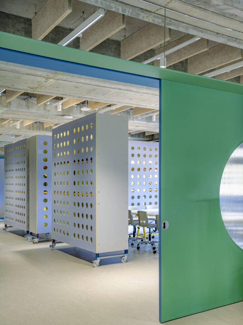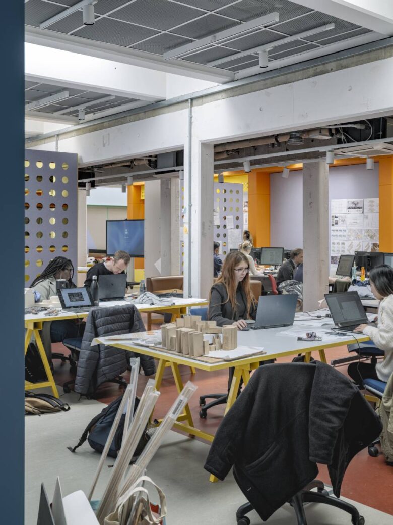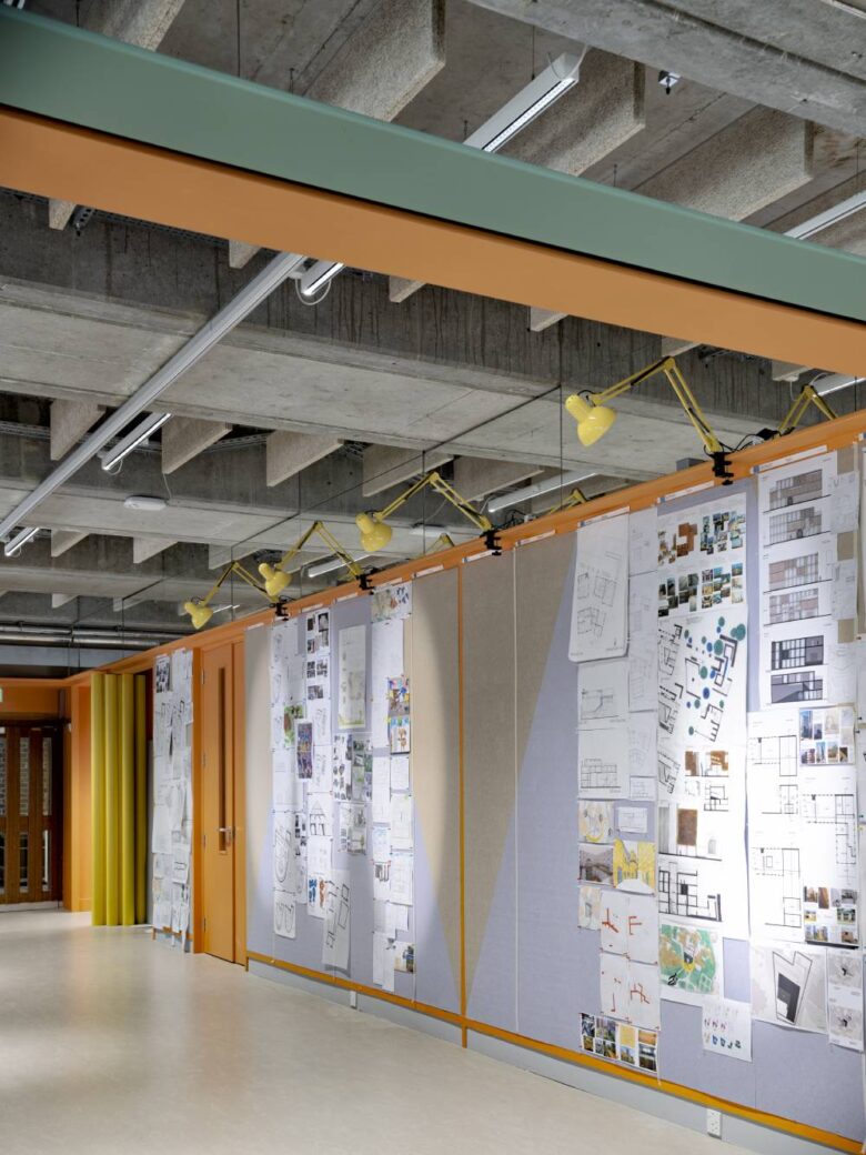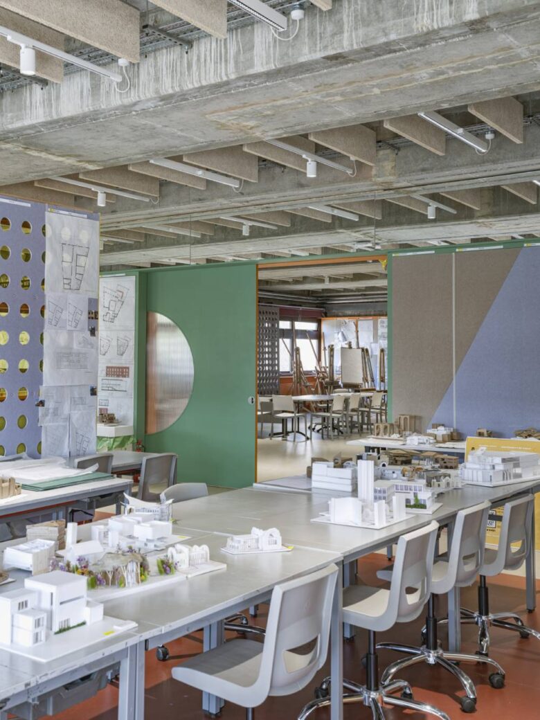 Alongside pivoted walls and colourful perforated screens, such multi-use partitions allow staff and students to tune adjacent spaces in or out when needed, such as holding small group seminars and workshops or offering a quiet room for focused independent work. Traditional pinboards were also implemented throughout each studio to easily accommodate collaborative work and creative brainstorming for students’ various architecture, design and planning projects. These adaptable features combined with the playful, vibrant palette of shapes and colours helps to establish the project as one that, according to Sam Jacob Studio, “recognises character, wit and delight as part of an essential role of architecture.”