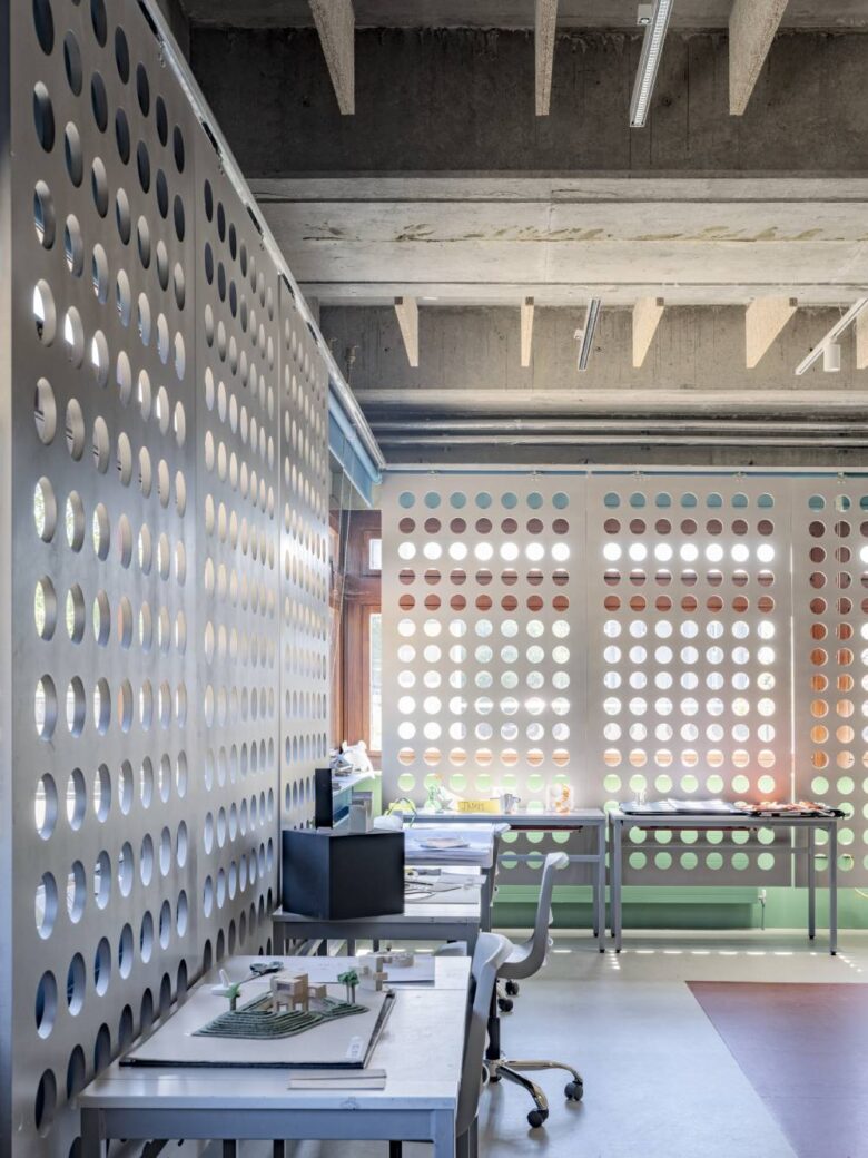 The interiors of the existing physics lab were first stripped out to expose the building’s Brutalist elements, including the concrete ceiling, metal beams and engineering fixtures. The design approach was then a minimalist one, only reincorporating walls that were absolutely necessary to the flow of each studio to account for a growing student body. These walls then became active spatial devices themselves through the addition of sliding doors and large polycarbonate portholes, as well as integrated workbenches, model plinths, storage drawers and lighting.