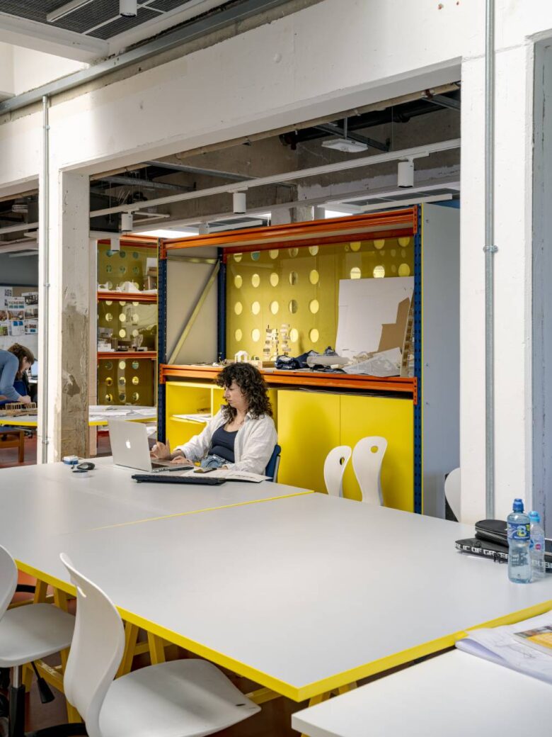 Also informing the project were famous artistic spaces including the Bauhaus school, Andy Warhol’s New York Factory and Paul Rudolph’s Brutalist Art and Architecture building at Yale University. Jacob saw each of these organisations as capturing the main focus of this project, described as “what happens between the logic of architecture and the happenstance of creative working”. The colour scheme, for instance, is taken from Swiss-French artist and architect Le Corbusier’s 1959 paint system, while the series of sculptural columns throughout offer more explicit architectural references: placed at the threshold of different workspaces, they act as 1:1 models of Canterbury Cathedral, the work of Romanian sculptor Constantin Brâncuși, and buildings by British architect James Stirling.