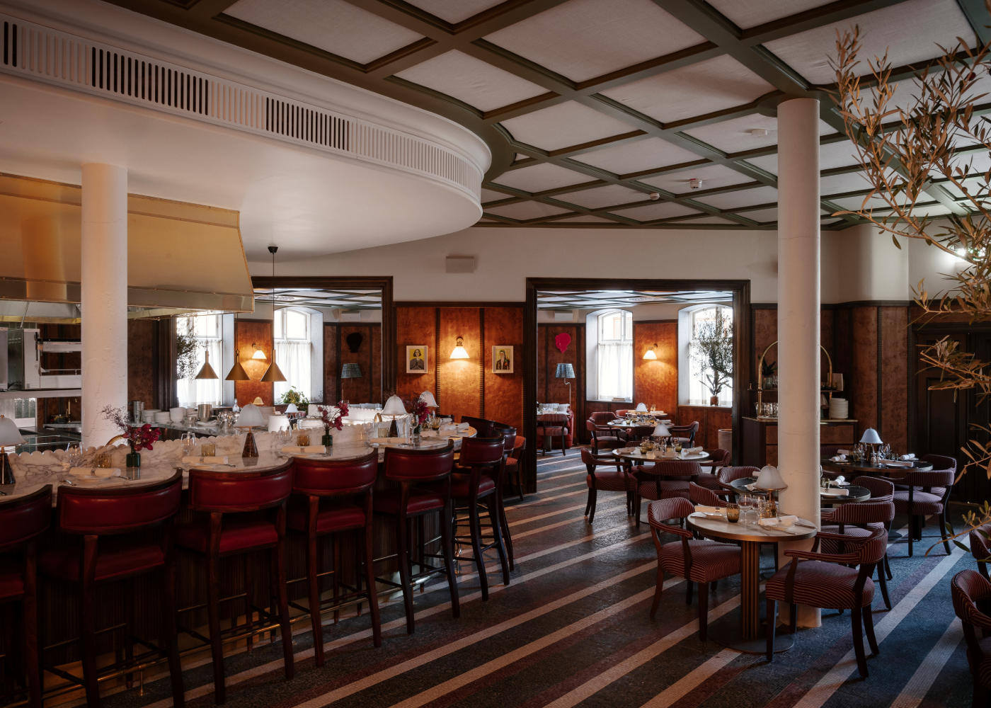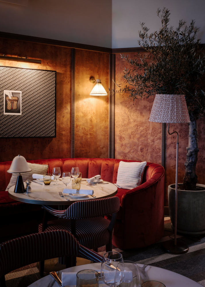 Adjacent to The Library is Soho House’s trademark restaurant, Club Cecconi’s. The North Italian eatery features an expansive green, aubergine and white striped mosaic floor complemented with bespoke Cecconi’s chairs, upholstered in a burgundy and green striped woven fabric by Scandinavian textile manufacturer Kjellerup. Red bar stools stand against a Carrara bar top and scalloped timber front.