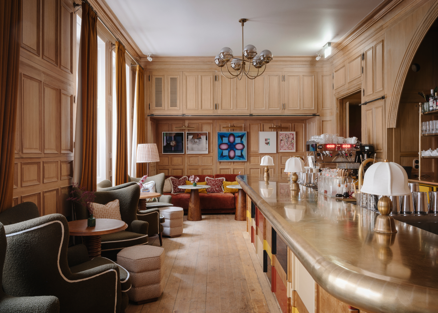 With pre-existing wood paneling, rich mustard-toned curtains and smoked glass chandeliers, The Library provides members with a comfortable and secluded nook. Including a bar with a contemporary checkerboard of block colours, lacquered front panels and a solid brass top features as the room’s centerpiece, the room is adorned with large wingback seats plus an orange banquette, tucked under a niche of panelled joinery. Tables formed of ornate timber burl are enriched further with Verde Luana marble.