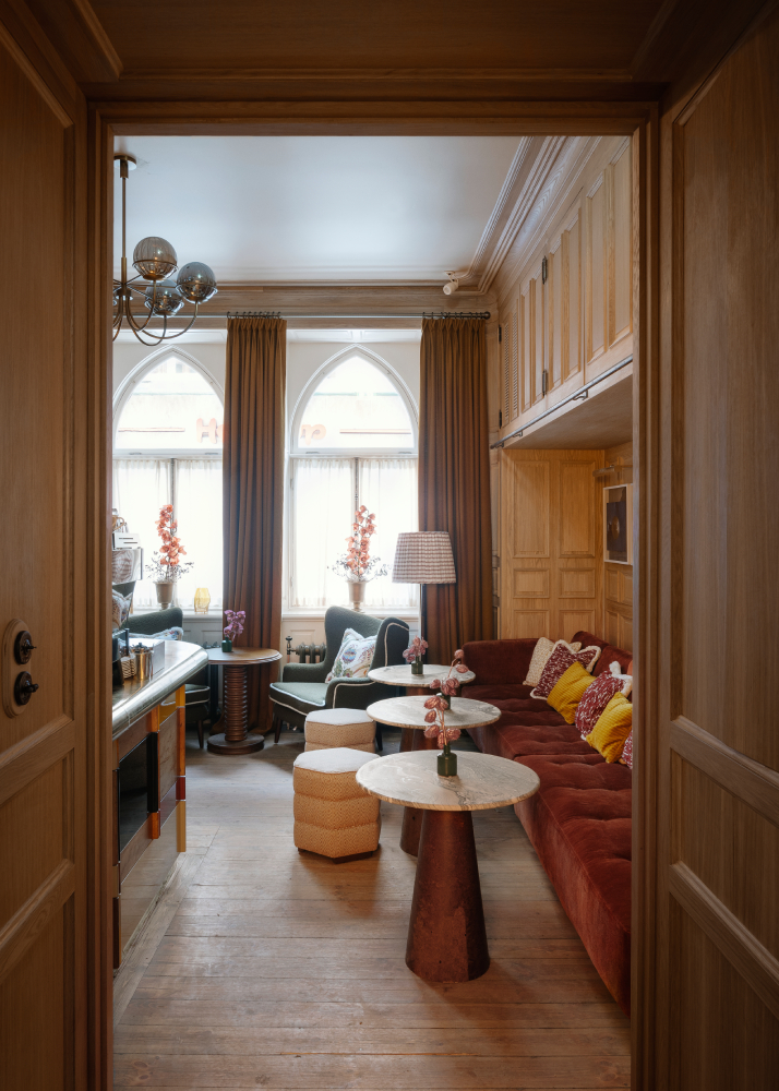 Elsewhere on the ground floor is House Studio, a more intimate space with a printed ceiling and walls, plus reupholstered Soho Home Garret swivel armchairs in boucle. The House’s fabrics were all selected to complement the red, yellow, green, blue and purple hues found within the church’s stained-glass windows.