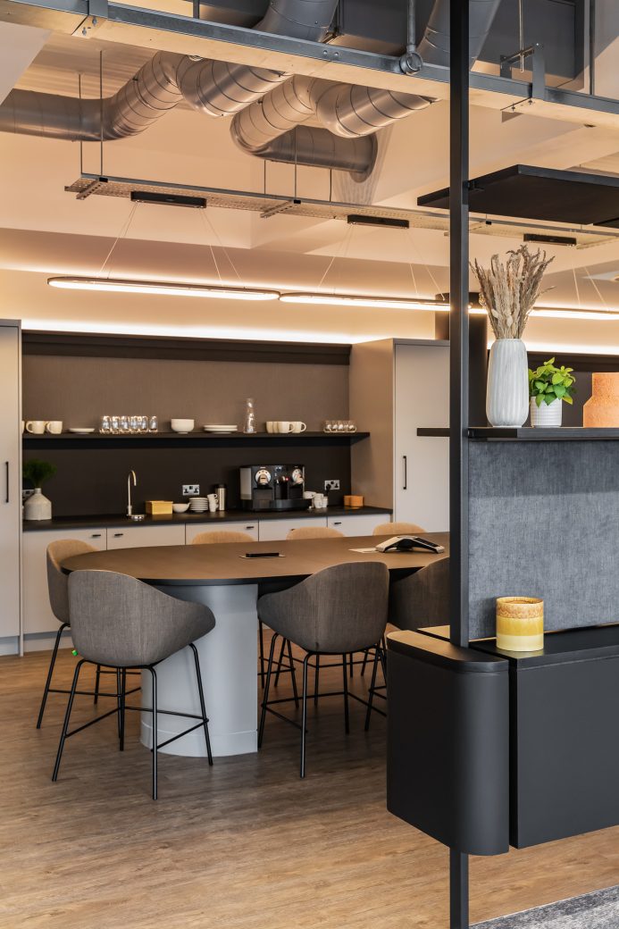 The feel for the business lounge is elegant, smart, neutral and natural and the design here includes feature joinery storage and a shelving unit with acoustic panel infills, providing framed views through and beyond to Manchester’s skyline. Curved lounge chairs from Hayche and occasional tables by Muuto and Ferm Living create a comfortable visitor setting upon arrival, whilst artwork and dressing items provide visual interest.