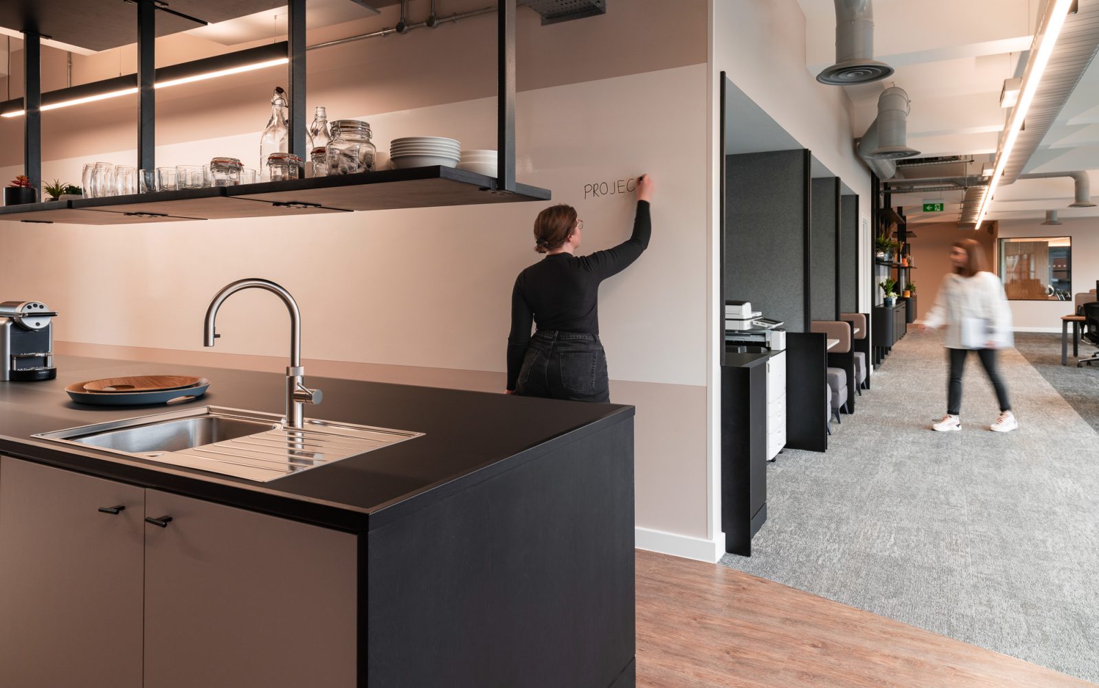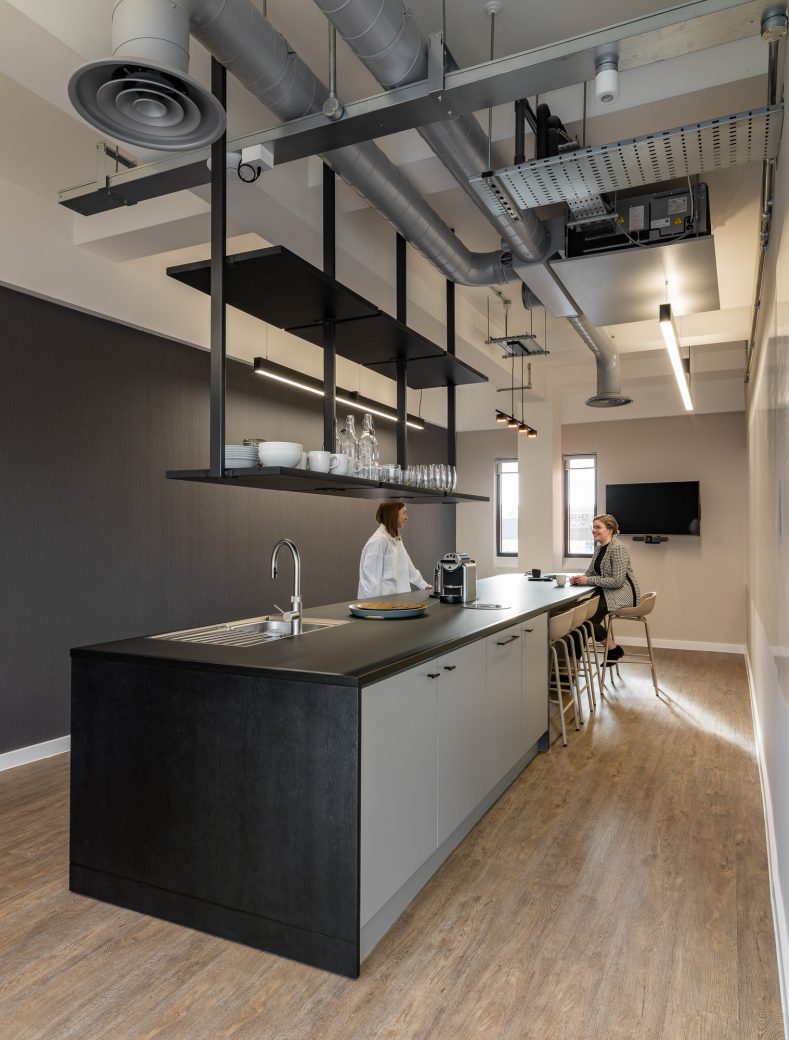 For the main open plan space, furniture includes smart desking furniture with warm timber tops and a black leg accent finish, plus a feature shelving screen with low level cupboards and acoustic panels. Stained ply joinery panels form divides to the booth-style seating with fixed upholstered seat backs. A concealed LED strip light behind the stained-ply joinery wall panel and textured wallpaper tie together the booth seating and a dedicated print area. Feature shelving above the staff teapoint is used for display, holding both crockery and glassware. The space also features an informal high meeting table with integrated power and a wall-mounted AV screen with write-on, wipeable wallpaper for collaboration and presentation, with a dozen counter height chairs from Normann Copenhagen.