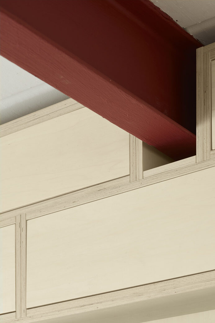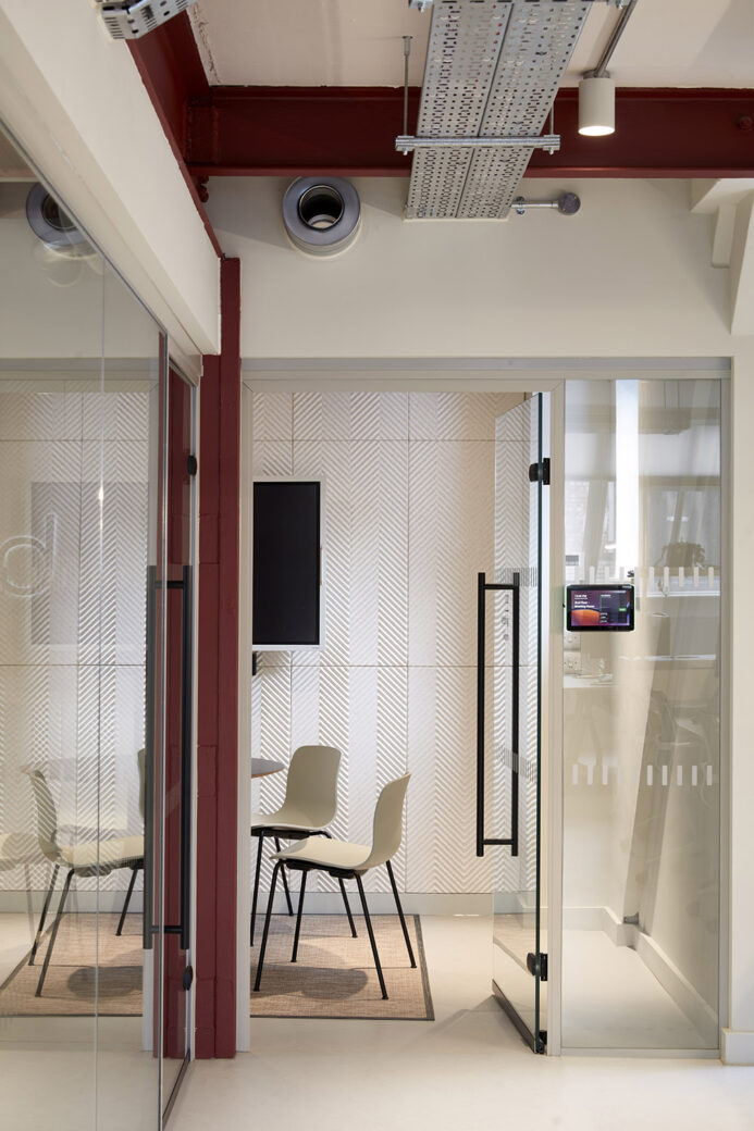 Retaining its industrial aesthetic, the reception area serves as a client-facing lounge area, equipped with meeting rooms, kitchen facilities and an array of modern conveniences. This industrial style is embraced across the upper floor workspaces, where painted crimson I-beams and corrugated surfaces are common threads throughout. As it was crucial for BSQ to have a workspace that supported both connection and various work styles, bright conference rooms with media walls are available for remote meetings and presentations, with the semi-private focus areas, decked in light timbers, being reserved for team members providing secretarial services for clients.
