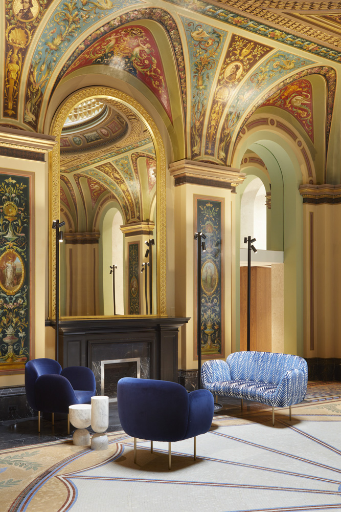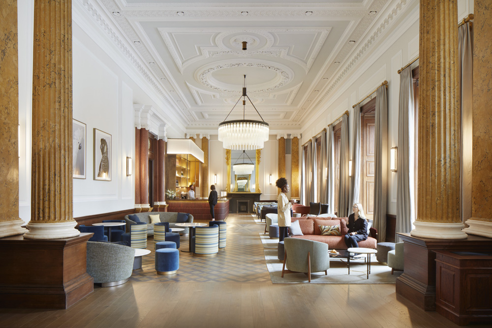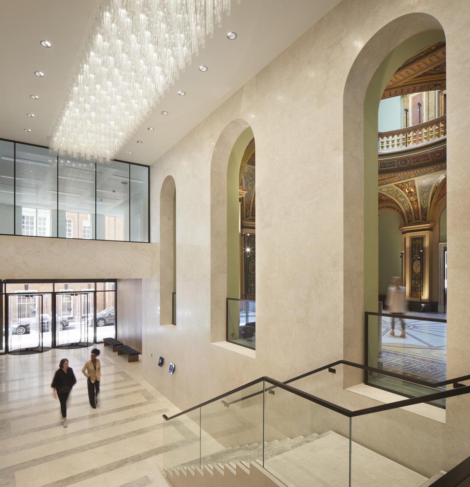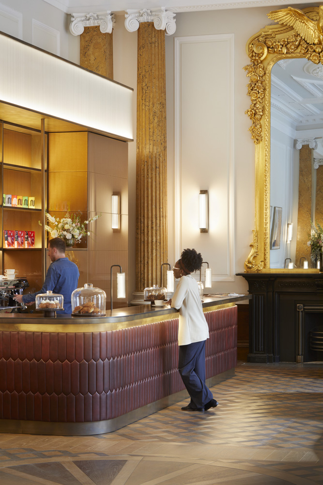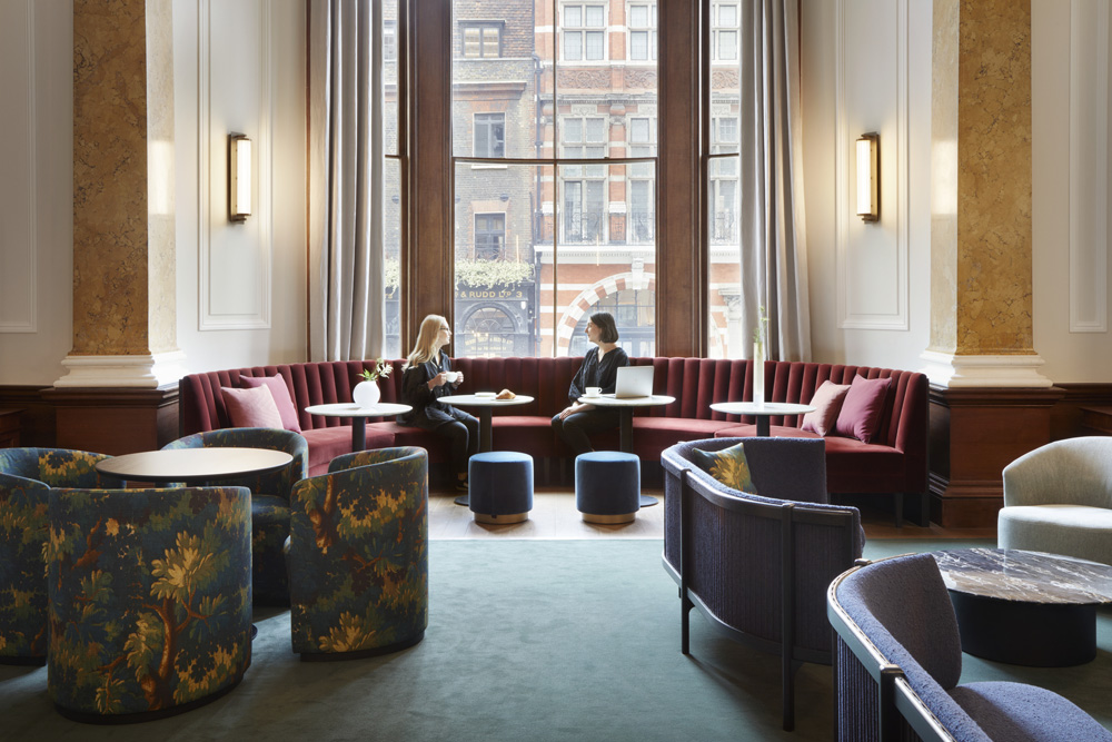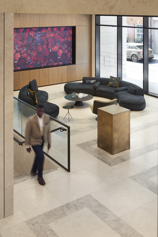 A double-fronted reception is the centrepiece of ‘The Saloon’. Reinstated as a key circulation route between the historical building and modern west wing extension, the room is filled with contemporary furniture upholstered in bold colours – nodding to the richness of the intricate heritage frescos, the floor tiling and the original dome on the fourth floor. Elsewhere, a pre-existing atrium serves as an additional entrance point, with a widened extension to evoke a grander sense of arrival. Inside, a comfortable welcome area features a circular suede sofa arrangement and round coffee tables on a stone floor, inspired by patterns found in historical drawings of the library that previously occupied part of the site. A discreet bronze welcome plinth and pair of bronze and suede benches, designed by Squire & Partners in collaboration with Benchmark, offer an alternative to the increasingly antiquated formal reception desk.