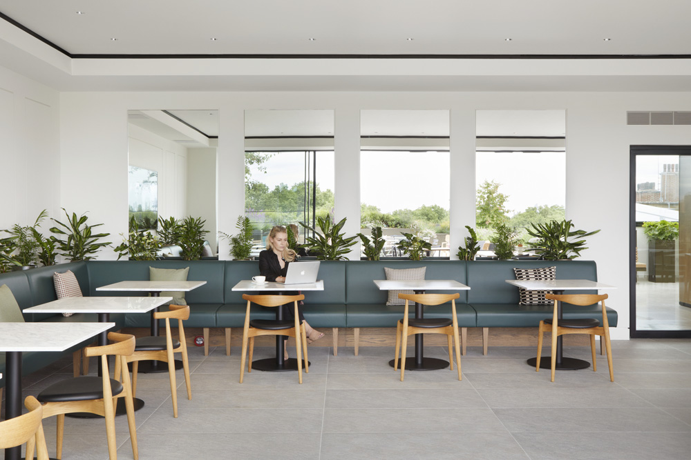 On the sixth floor, once discordant areas have been consolidated to create a swish 3,500 sq ft rooftop pavilion and terrace with sweeping views across Westminster and Green Park. Terrace furniture and integrated seating create a multi-use space for meetings, socialising and large events, whilst lush and abundant landscaping (including a living green wall and large planters) offer a connection to nature. Internally, the new pavilion features banquette seating and a bespoke bar serving daytime snacks and evening drinks, providing an additional work environment away from the desk or meeting room.