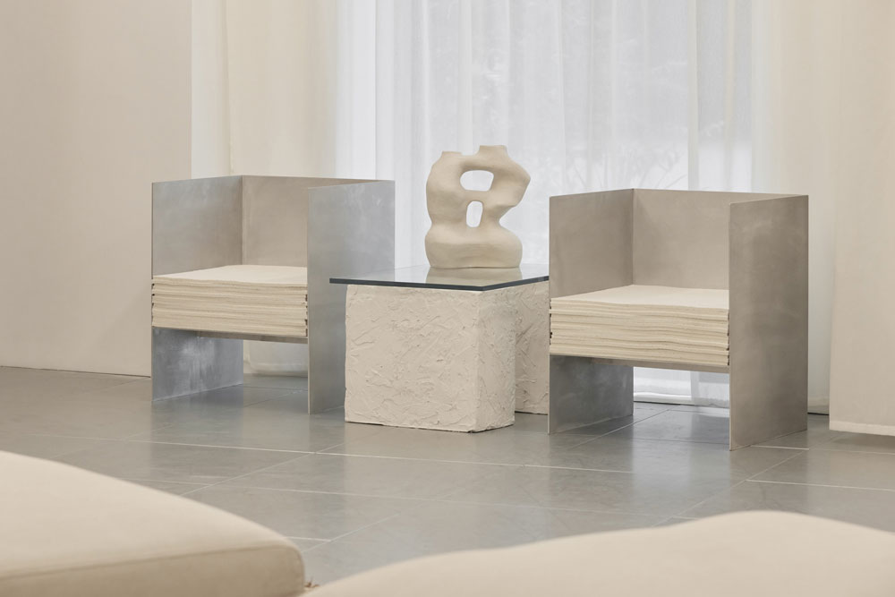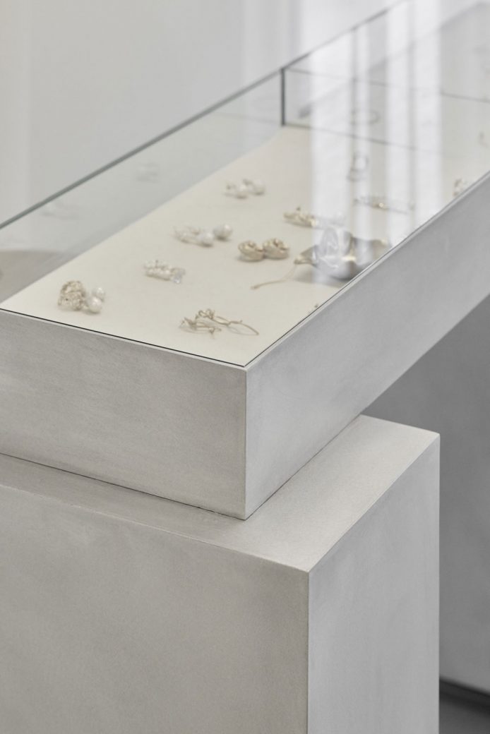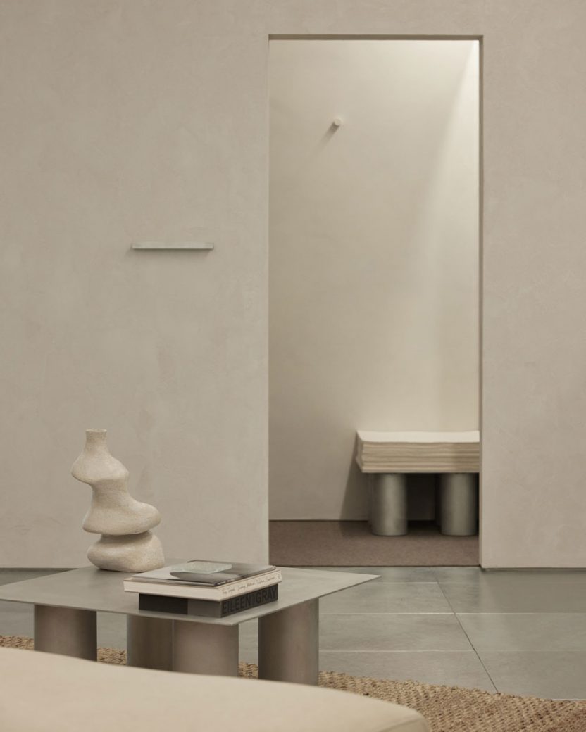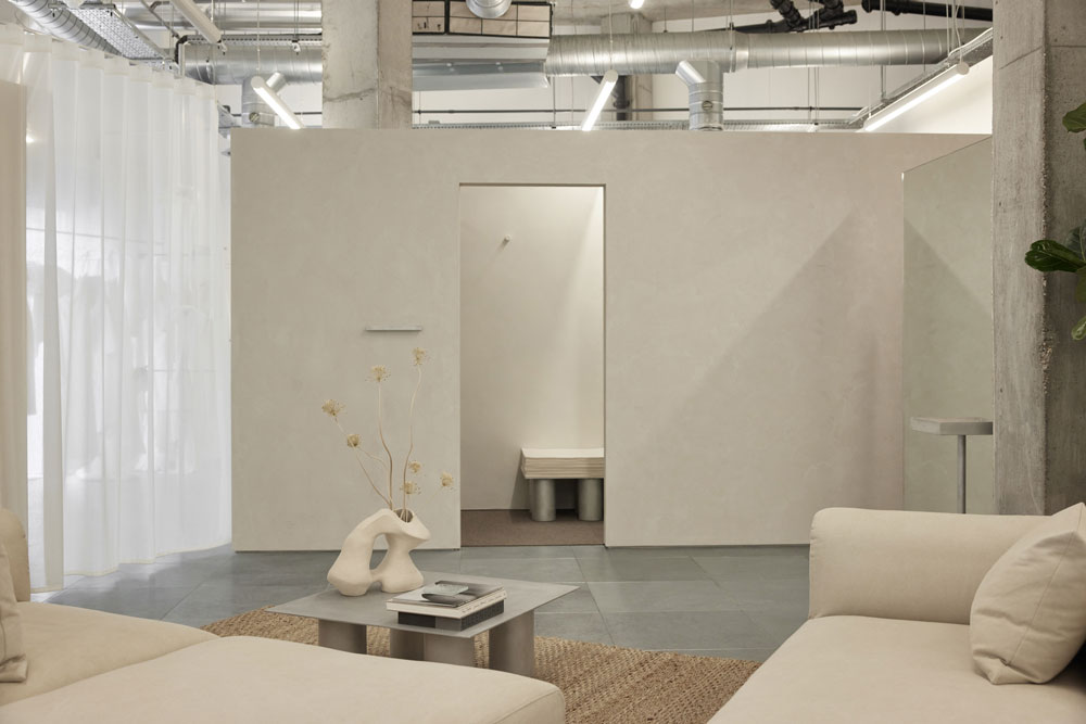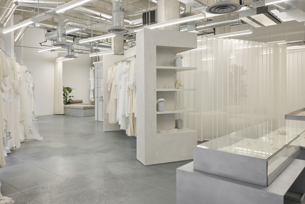 Materiality was a key source of inspiration for the designers and the starting point for the design process. Understanding that the collections on display will feature tonal white, silky textiles, the studio introduced a range of bold materials that would compliment and contrast the raw, industrial features of the space. Bespoke aluminium furniture and retail consoles, along with scaffolding display rails complement exposed pipework in the ceiling and an industrial raised access floor often used as the subfloor in commercial spaces. Hand-finished clay plaster and lime wash finishes on the walls and neutral toned curtains and upholstery add softness and comfort to the space.