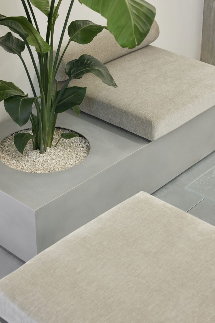 Unlike more conventional bridal stores, The Fall is designed around two central fitting rooms and lounge areas which offer brides and their guests an intimate and private space for appointments. Offering a serene oasis for the bride, the two fitting rooms sit back-to-back between lounge areas with custom-made seating where their guests can relax and enjoy the experience. Large curtains encase both spaces, creating a theatrical moment whilst also offering privacy for the bride and her party. Designed by Studio Jey, industrial style rails made from scaffolding with ceramic sculptural ends showcase the selection of dresses.