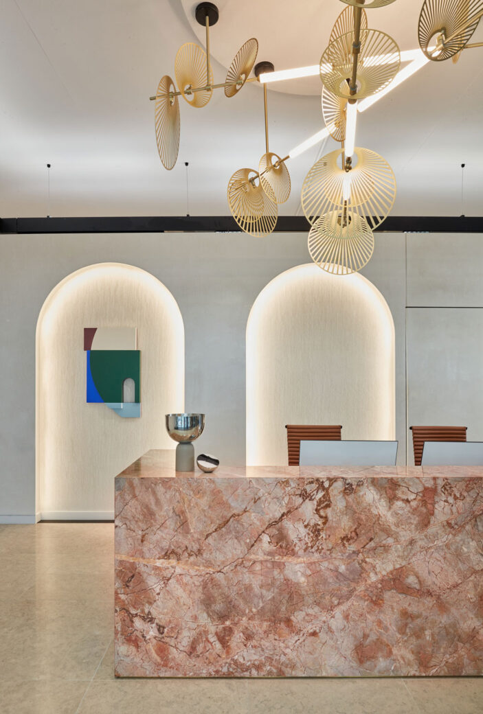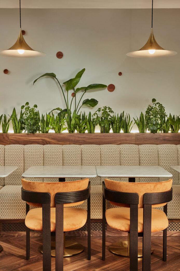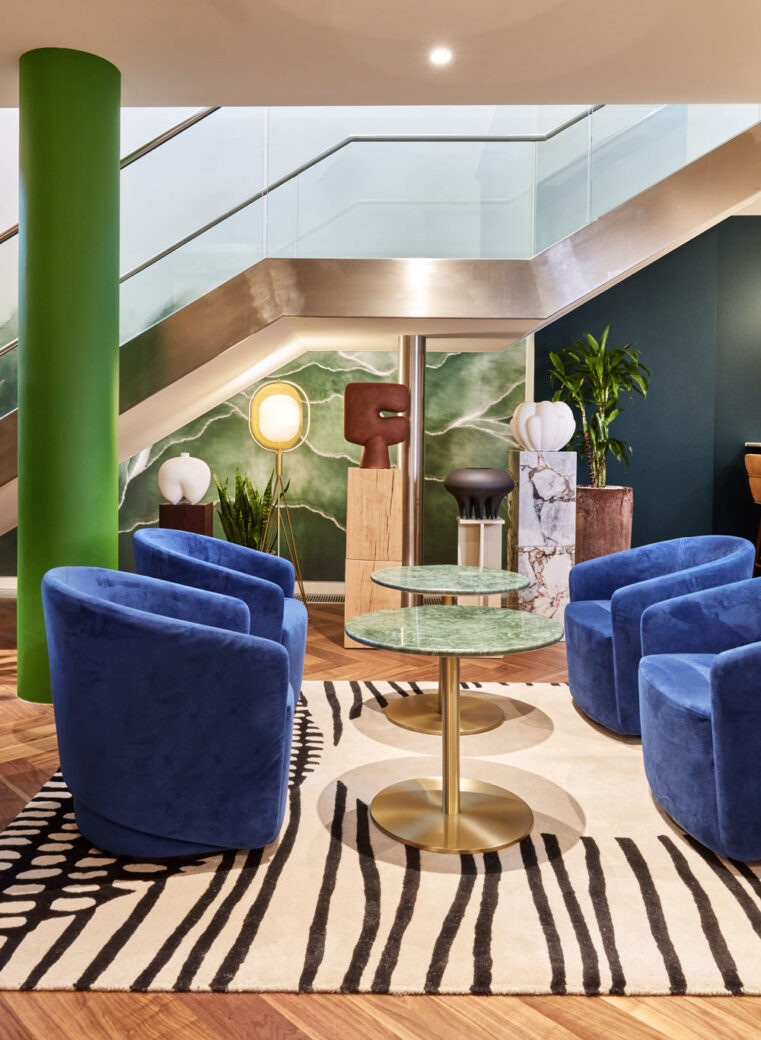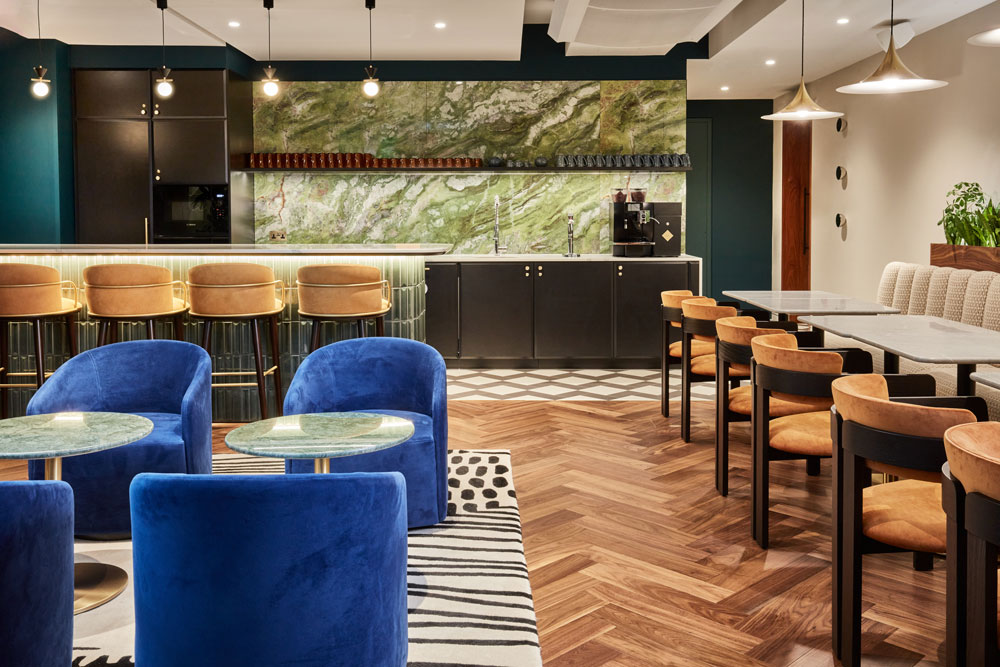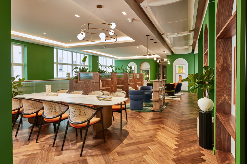 Studio KKD has partnered with office provider Grosvenor to introduce a new workspace offering that focuses on flexibility and hospitality – aiming to stand out with a unique identity and ability to adapt to future changes in a rapidly evolving market. The collaboration has resulted in six unique ‘Flex by Grosvenor‘ workspaces so far in London’s Mayfair and Belgravia. The latest offering at Mayfair’s 50 Grosvenor Hill features an ‘Internal Garden’ concept, with lush greenery and vibrant patterns focusing on wellbeing. A ‘premium’ experience is emphasised, balancing functionality with comfort and richness in colour, materials and furniture selection. In the social areas, a variety of soft seating offers a place to lounge and dine during the day, designed to transition into an event space in the evening.