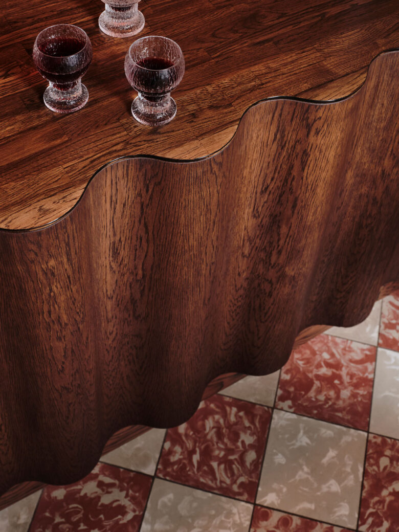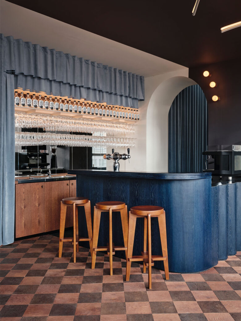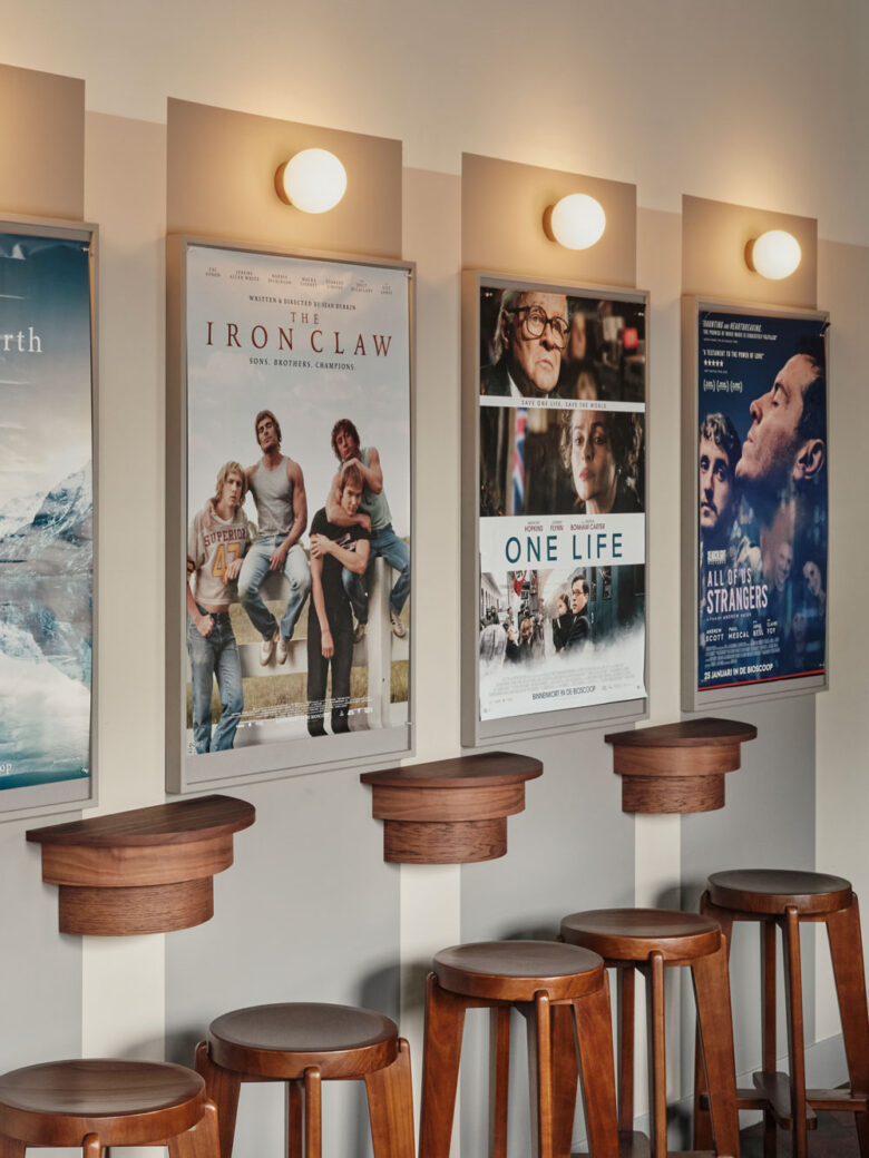 Those in the mood for an evening tipple can head to the statement island bar, which was designed as an ‘ode to cinema and the performing arts’. A stage with a three-layered velvet curtain serves delicious cocktails under a spotlight, while also offering guests direct access to the terrace lounge outside. Delving into detailed touches, Studio Modijesfsky weaved this curtain motif into the bar itself, with soft undulating waves carved into the dark oak and topped with zinc for a sleek finish. Ascending two staircases lined with posters, visitors can also find an event space, film lounge, ticket desk and a balcony overlooking the wildflower garden, cementing De Witt’s status as a chic, multi-purpose hub for film, food or a cup of coffee.