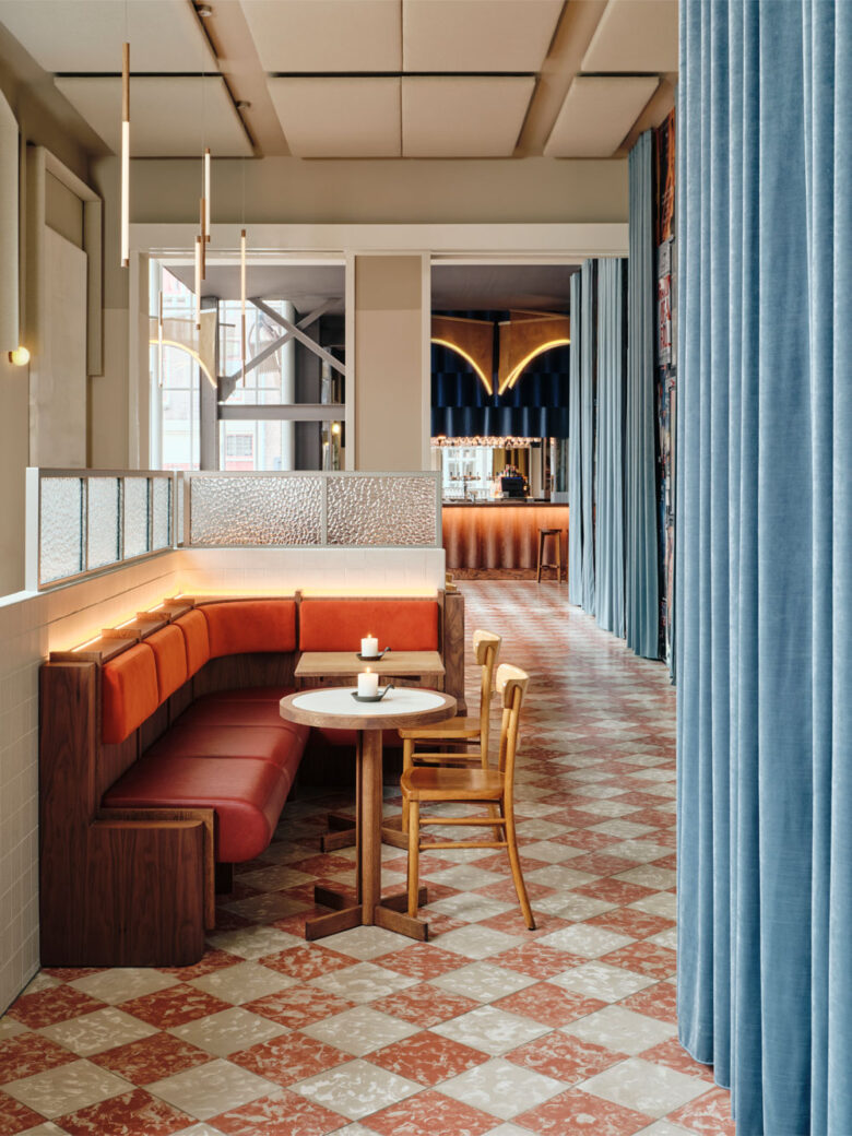 Recalling vintage visions of the silver screen, the ticket booth is encased in full-length blue velvet curtains and joined by a wall emblazoned with movie posters. Restored vintage chairs in the restaurant are joined by bespoke tables and spherical pendant lights, while in smaller nooks of the brasserie, custom leather benches add a touch of drama in a bold shade of vermillion. These warm pops of colour continue throughout with orange chequerboard tiles and plush rust armchairs. Each area of the brasserie is visually connected to another by hanging tubular lights in the shape of cloister arches, given extra depth by the aged brass mesh crowns above them and adding a final nod to the former convent.