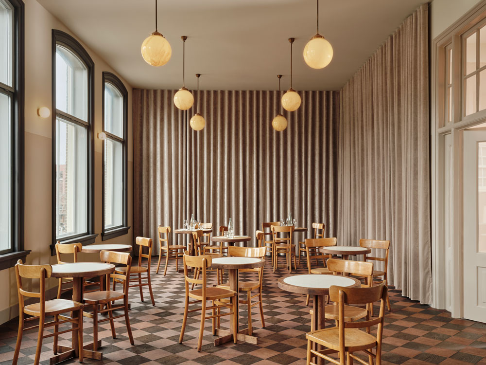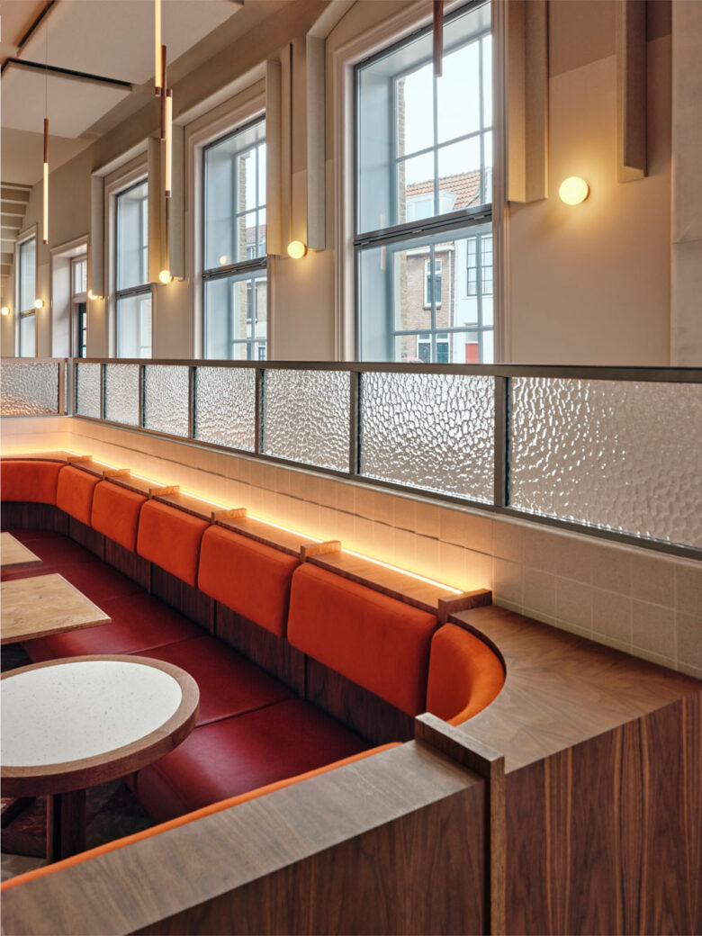 Furthering this intimate connection to Dordrecht, Amsterdam design firm Studio Modijefsky formed its initial concept around ‘Dordtse kleuren’, the city’s official colour palette. As the first Netherlands city to adopt its own colours, this palette now serves as a symbol of civic pride as well as guiding the design vision for the new and improved De Witt, while more visual motifs from its bygone days as a convent and schoolhouse – such as frosted glass dividers, class benches and wimple-shaped window frames – are weaved throughout.