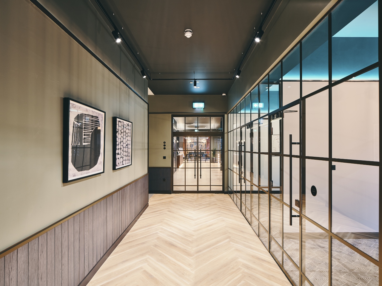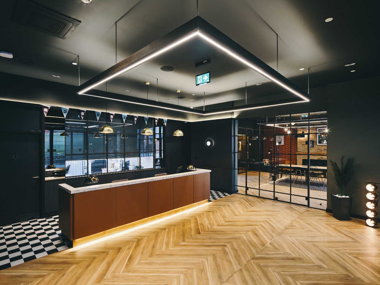 ‘Responding to the brief to create a sophisticated and grown-up scheme, our material treatment included bronze finish, Crittal-style doors and glazing, referring directly to the external metalwork, plus a double dado rail treatment that further ties into the door and window levels,’ says David. Large, rectangular lighting rafts in bronze-painted timber continue the metallic allusions. The colour palette features neutral colours throughout, with subtle, darker highlight areas in browns, greys, deep blues and olive greens. Flooring throughout is in Amtico herringbone timber, with highlight areas in black and white chequerboard tiling or elegant carpet insets by Newhay. Planting is also incorporated throughout, though in an unregimented way to ensure the space has a relaxing and non-corporate feel.