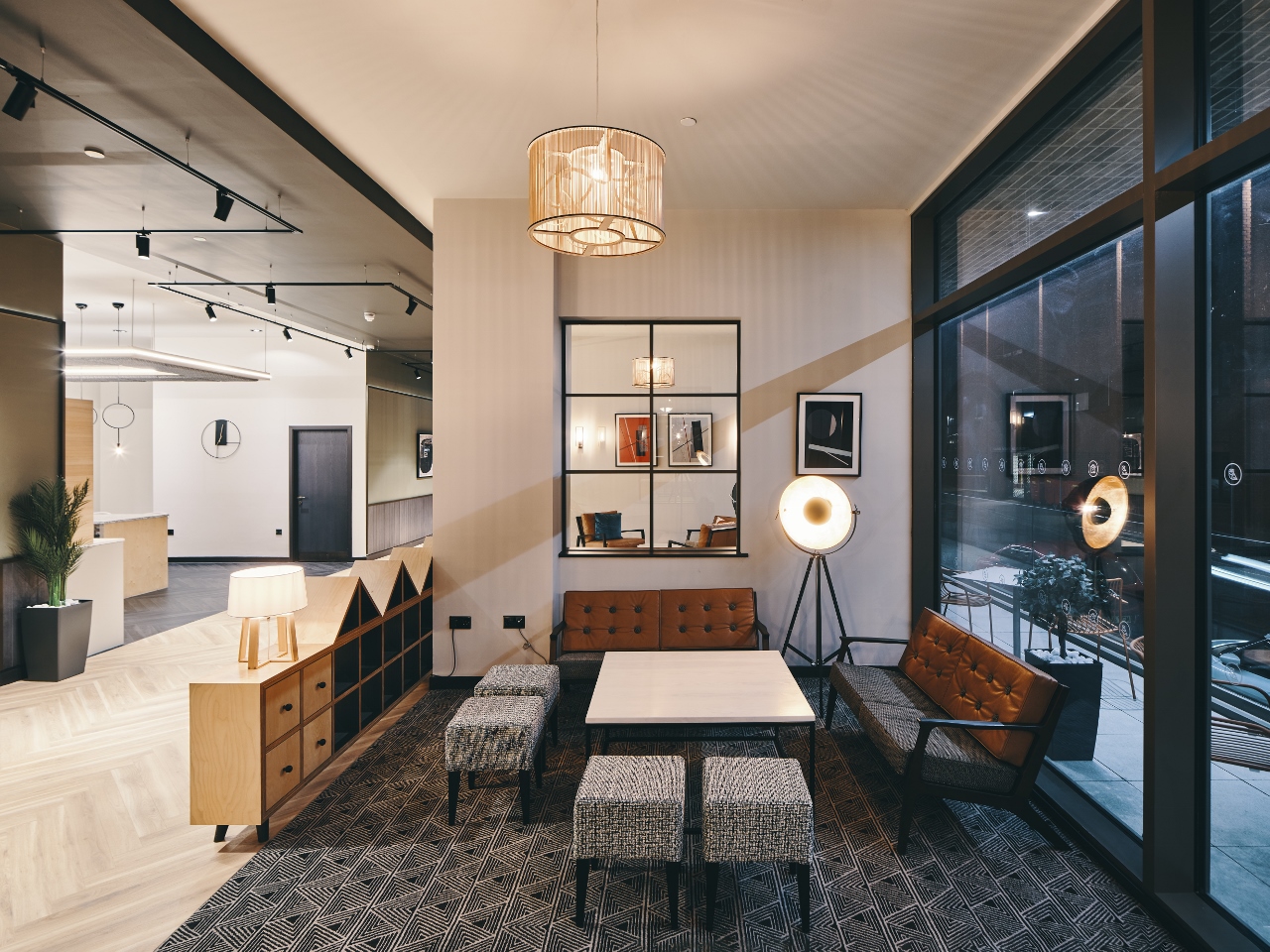 The interior design treatment for the amenity spaces took initial inspiration from the building’s architecture, where the materials palette references a recognisable local residential vernacular, with a broadly 1930s feel, including brushed brick with a pale-yellow tone and bronzed anodised aluminium window frames. The latter detail directly inspired, for example, the use of bronzed metal framework within the interior.