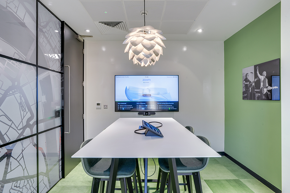 ‘The meeting rooms are named after artists with origins in Soho. In the Pink Floyd meeting room, eye catching pink Dye Lab carpets by Shaw Contract make a bold statement, with more pink upholstered furniture and full wall images.’