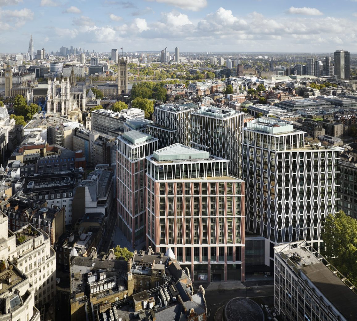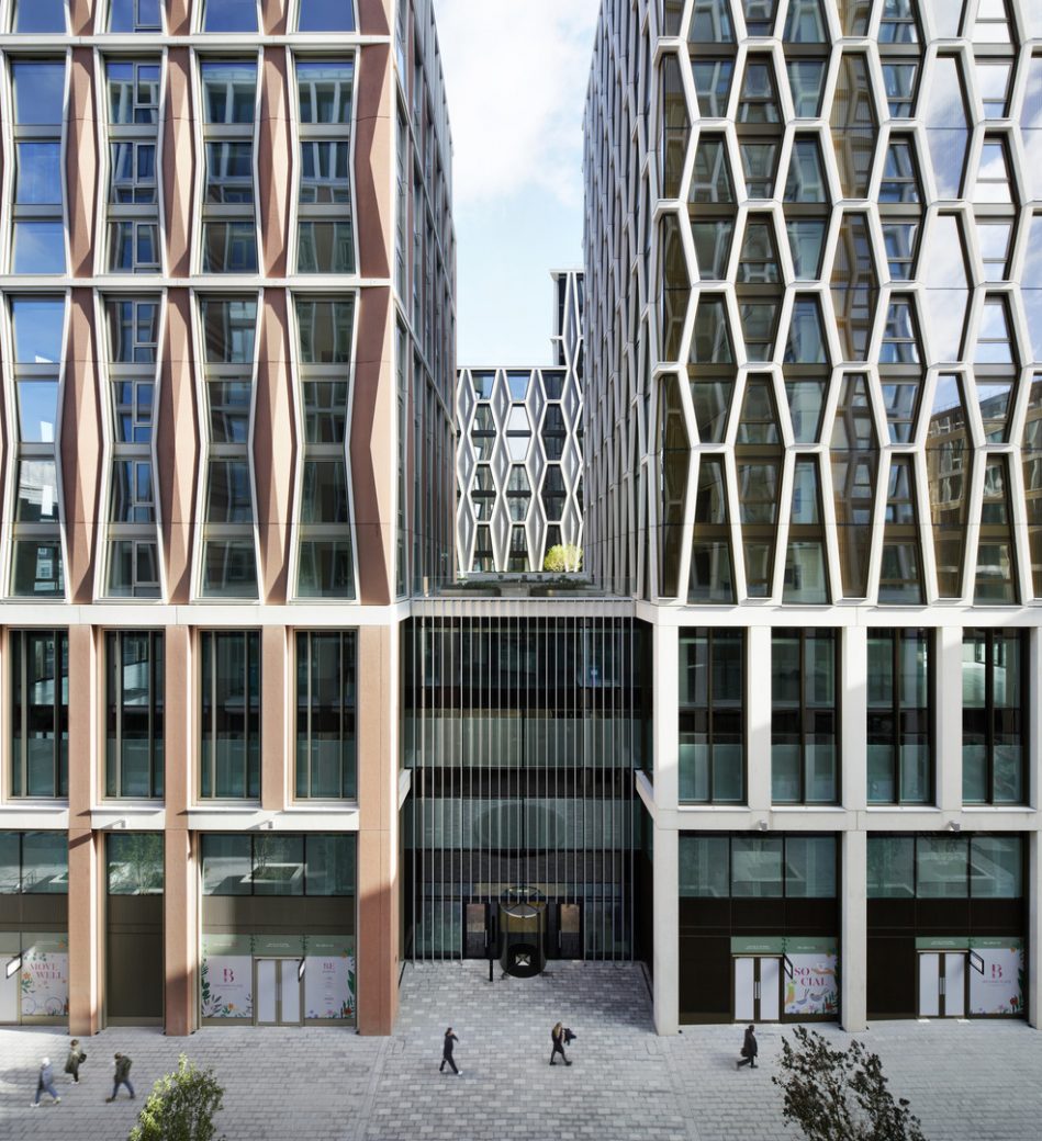 The Broadway by Squire & Partners is a 1million sq ft development residing in Victoria, London. What was once a 1960s defensive block for the Metropolitan Police Headquarters is now made up of six towers clad in a dynamic geometric pattern inspired by the nearby 55 Broadway.