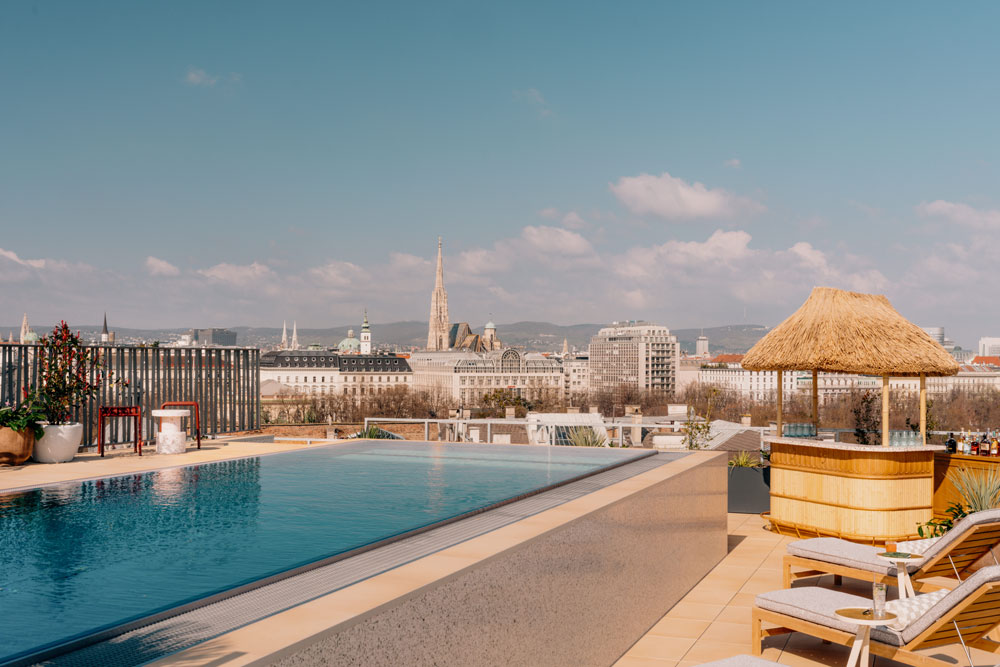 Just off the lobby is The Hoxton Vienna’s all-day bistro, Bouvier – described as New York meets European cuisine, the restaurant features distinctive checkerboard flooring with deep red wall panelling and retro ad posters for an added touch of nostalgia, while just outside is a 70-cover terrace with fringed parasols, tiled table-tops and lush greenery for al-fresco dining. Perched on the roof of the building is Cayo Coco, a Cuban-inspired terrace bar boasting unbeatable views of surrounding Vienna and the Austrian Alps. Here guests can enjoy a menu of rum cocktails and barbecue small plates while lounging by the open-air pool, with bespoke rattan furniture, blue ceramic tiles and bold artwork striving to capture the essence of tropical Havana.