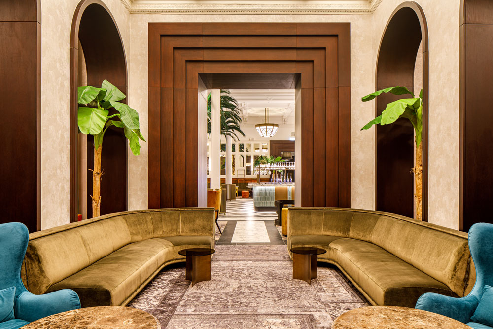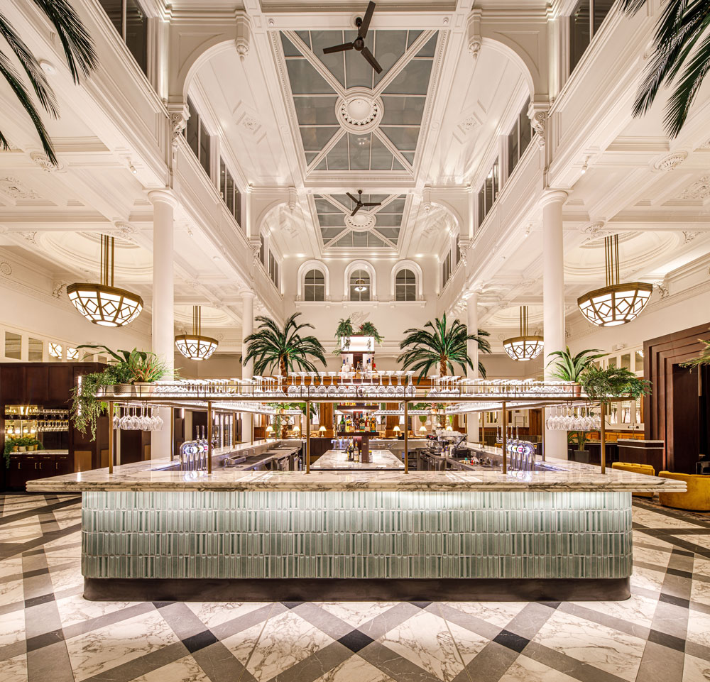 Lighting is a hero here, and the studio worked with Artin Light and Northern Lights to curate the various lighting features, including decagonal chandeliers on the Palm Court, each fitting comprising laser-cut antique fretwork and a warm atmospheric glow.