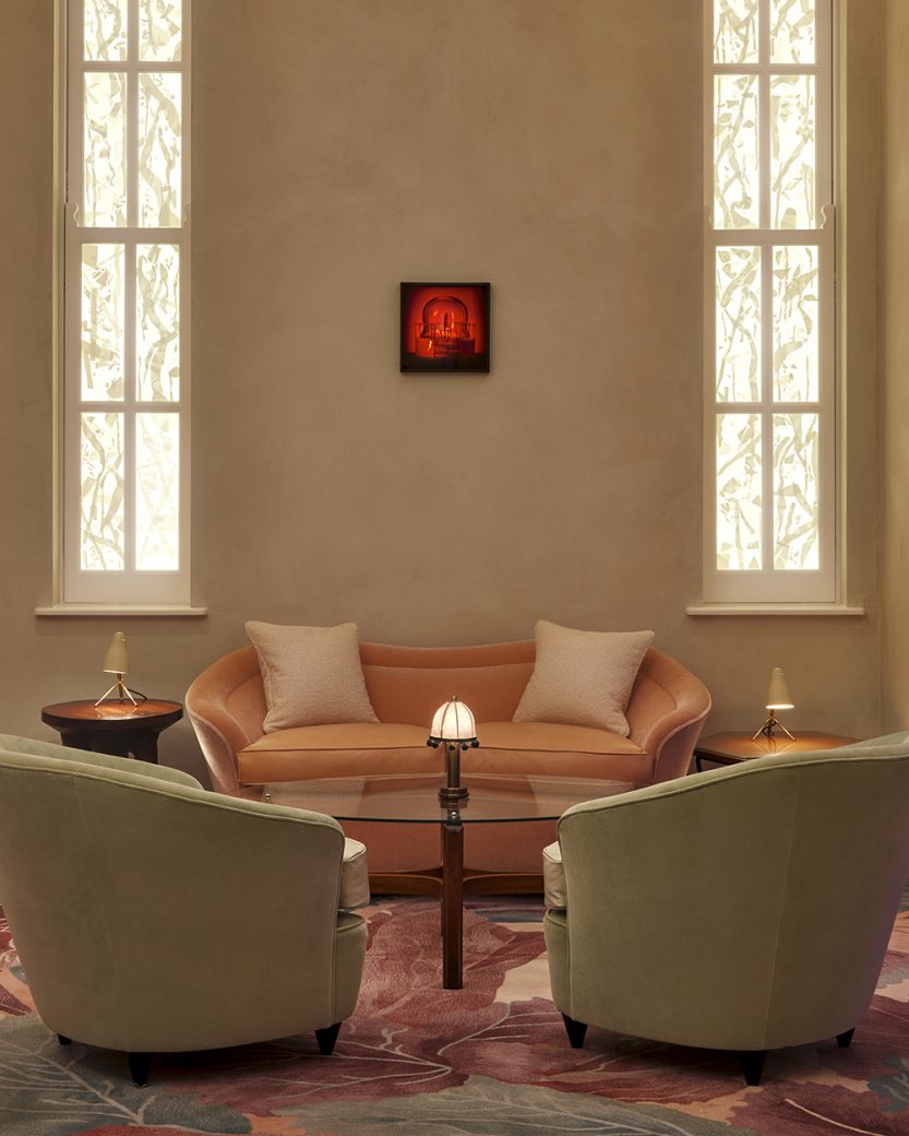 Flanking the fireplace, two sets of striking stained-glass windows in vivid reds and blues by celebrated British glass artist and painter Brian Clarke instantly command attention and set the tone for a venue that feels both elevated and relaxed all at once. Beyond the central fireplace, a series of seating areas feature an eclectic mix of furniture – bespoke pieces from Bryan O’Sullivan studio and vintage mid-century finds – reflecting the studied calm of a well-appointed sitting room. Striped armchairs, antique lighting and floral rugs are complemented by a collection of ceramics and objects d’art, which will be rotated on a continual basis, housed within a partition wall rendered in a pale pink hue to highlight the artworks in all their splendour.