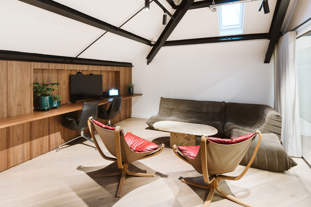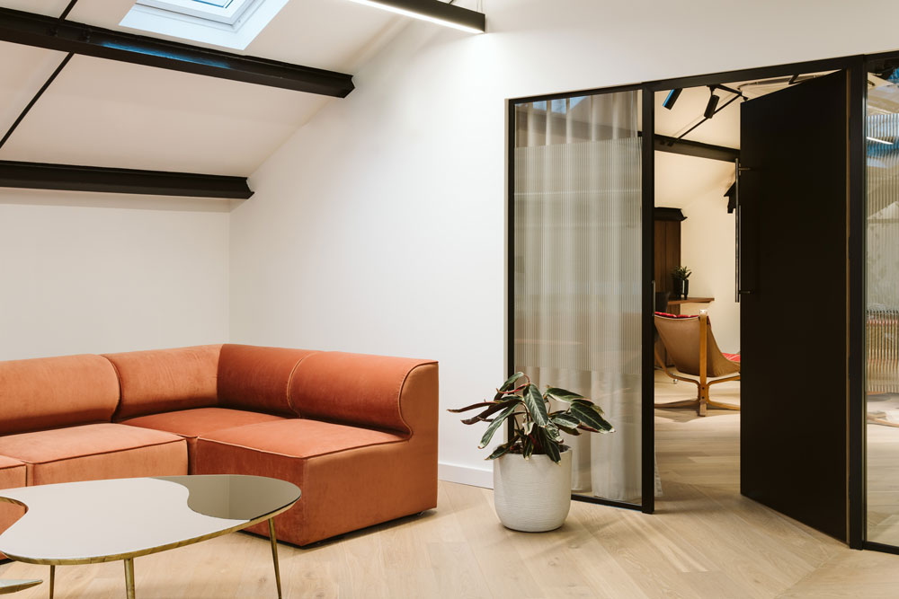 The design team worked closely with both TodayTix’s CEO and employees to help them craft a human-centric head office that genuinely caters to the company’s day-to-day needs. In particular, the CEO was enthusiastic about incorporating his passion for vintage furniture into the design, scouring Paris flea markets for statement pieces and eventually donating feature sofas and chairs from his own collection. These eclectic pieces continue in the CEO’s office on the top floor, joining the building’s feature skylights and exposed steel beams, as well as an informal space within the office to engage with staff when needed.