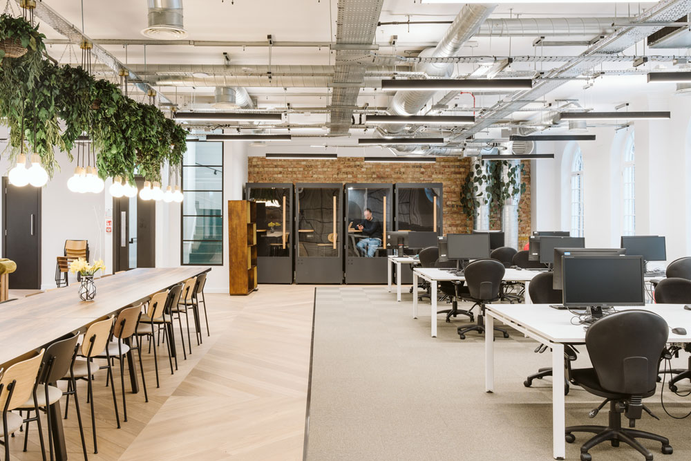 Little traditional, fixed desking was initially required due to the company’s hybrid working policy, allowing Thirdway to focus their efforts on creating social areas, meeting spaces and breakout zones. The emphasis was therefore on creating areas with a convivial, ‘front room’ feel – almost evoking a members’ club vibe – as well as larger meeting spaces, plenty of breakout furniture and phone booths for one to two people to conduct focused, uninterrupted calls or Zoom meetings at a time.