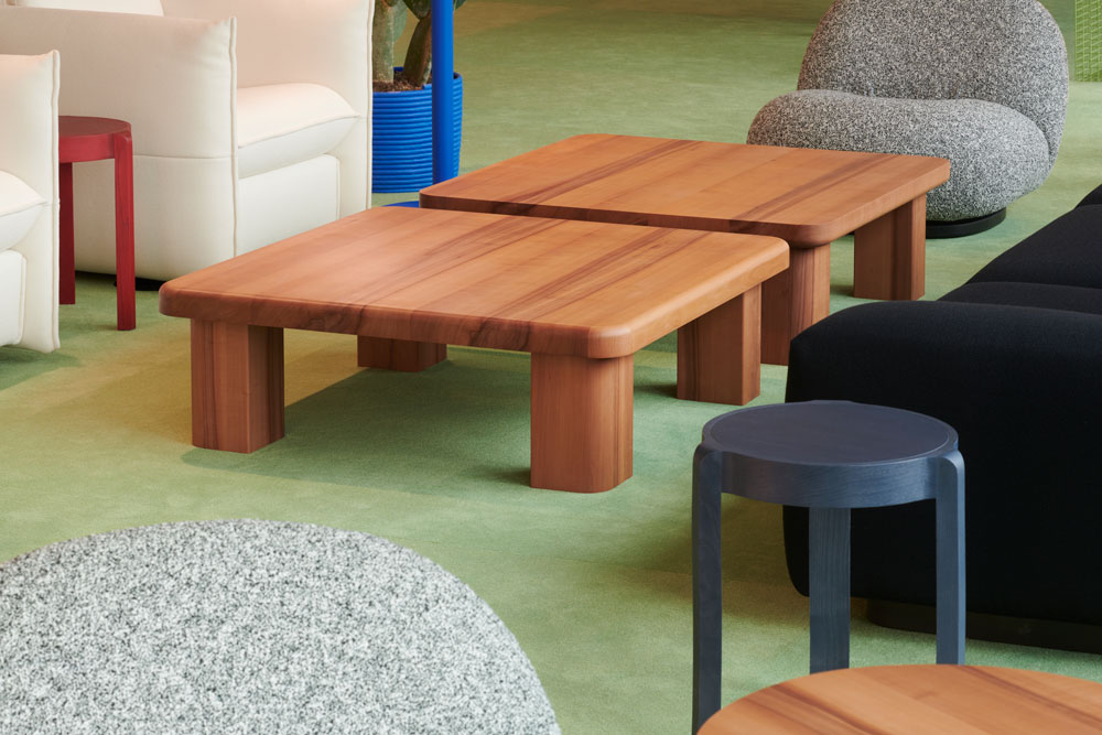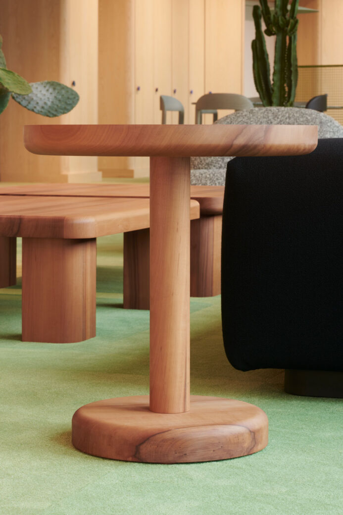 Furthest from the entrance lies The Focus Zone, a space for quiet independent work. Here, employees can find more height-adjustable hot desks, this time painted in a deep black varnish to encourage concentration. As well as a palette of bold hues, Studio Luiz Albisser also mixes matt and gloss textures to convey a dynamic, multi-layered feel, while the pastel green carpet tiles throughout help to unify the whole scheme and offer the studio a cohesive base to experiment with décor. The building core itself is clad with veneered ash, allowing for the construction of integrated storage units – designed to maximise space in a smaller footprint as well as enable