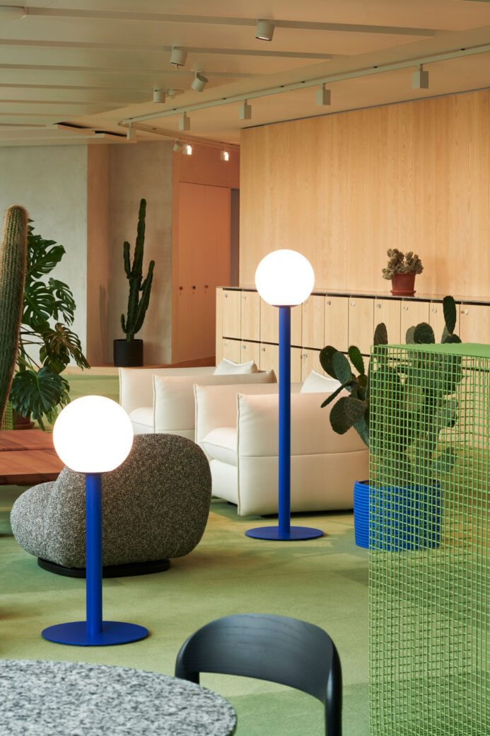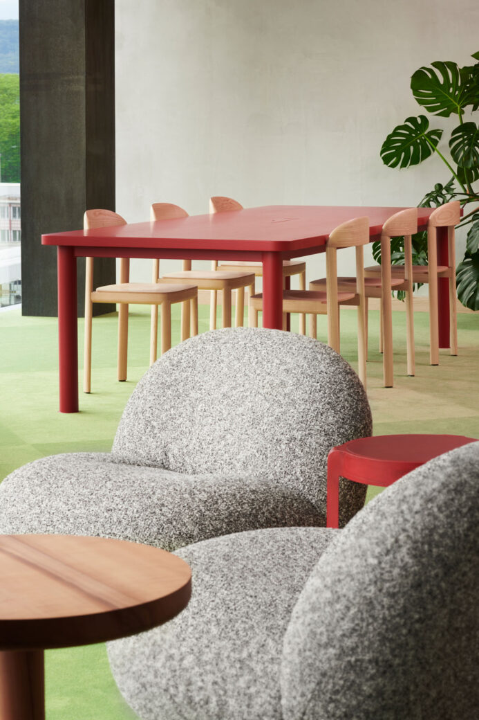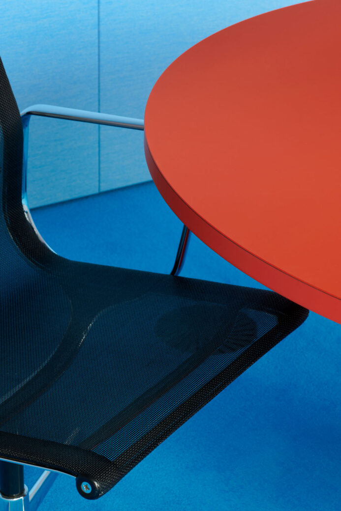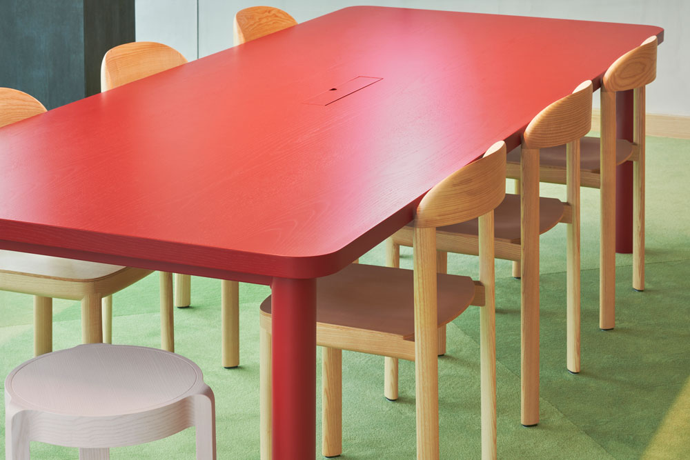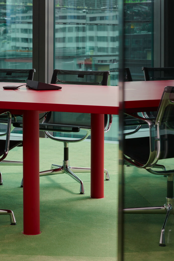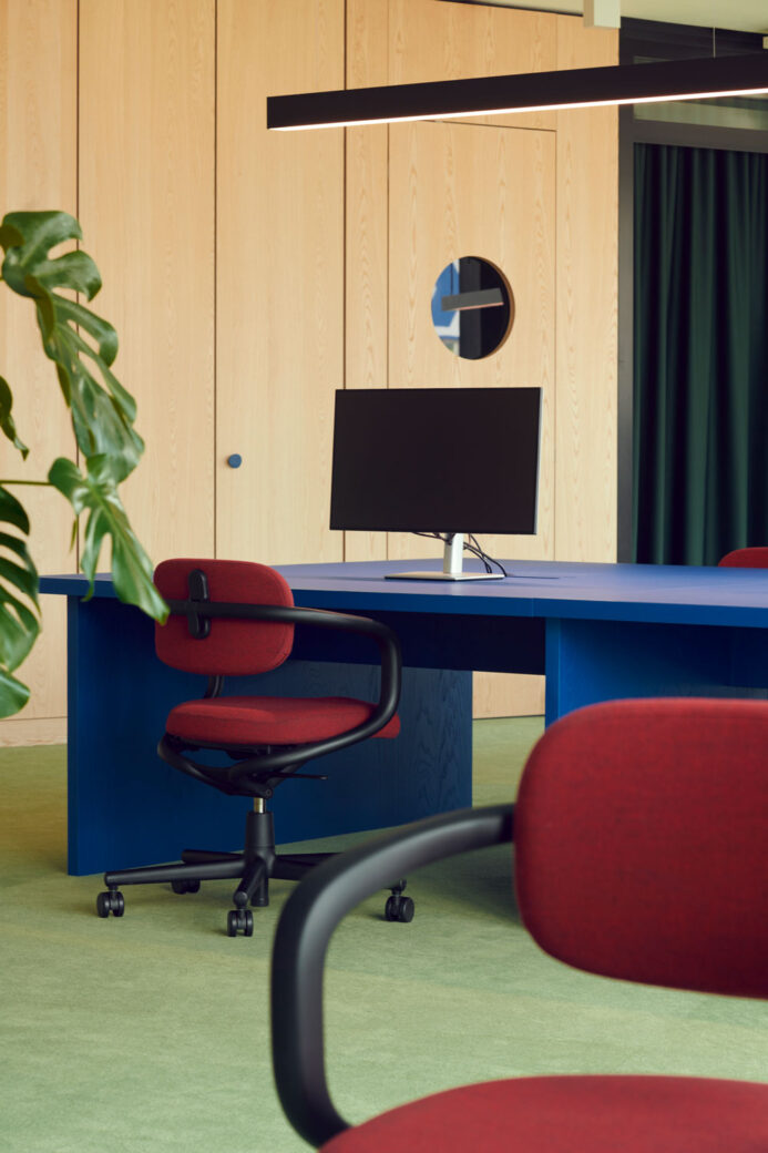 Over in The Collaboration Zone, employees can choose to creatively brainstorm either at a generous workbench or the central meeting table in a bold, pillar box red. Depending on the task at hand and the work style required, staff can also opt to hot desk with a handful of height-adjustable desks painted in a striking deep blue varnish. In a separate, glass-walled space, team collaboration or client meetings can continue in the private meeting room, which features sheer green light-filtering curtains for added privacy and improved acoustics.
