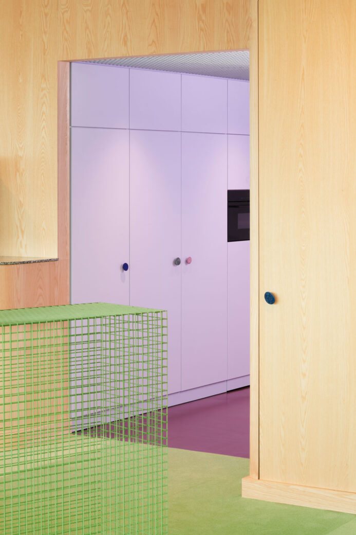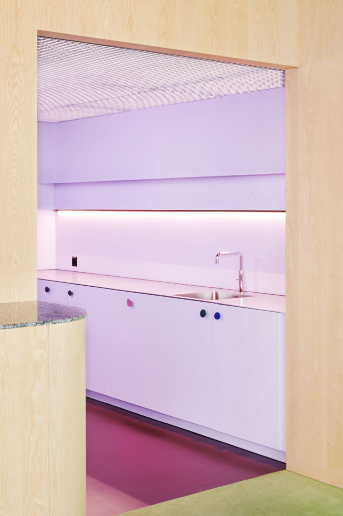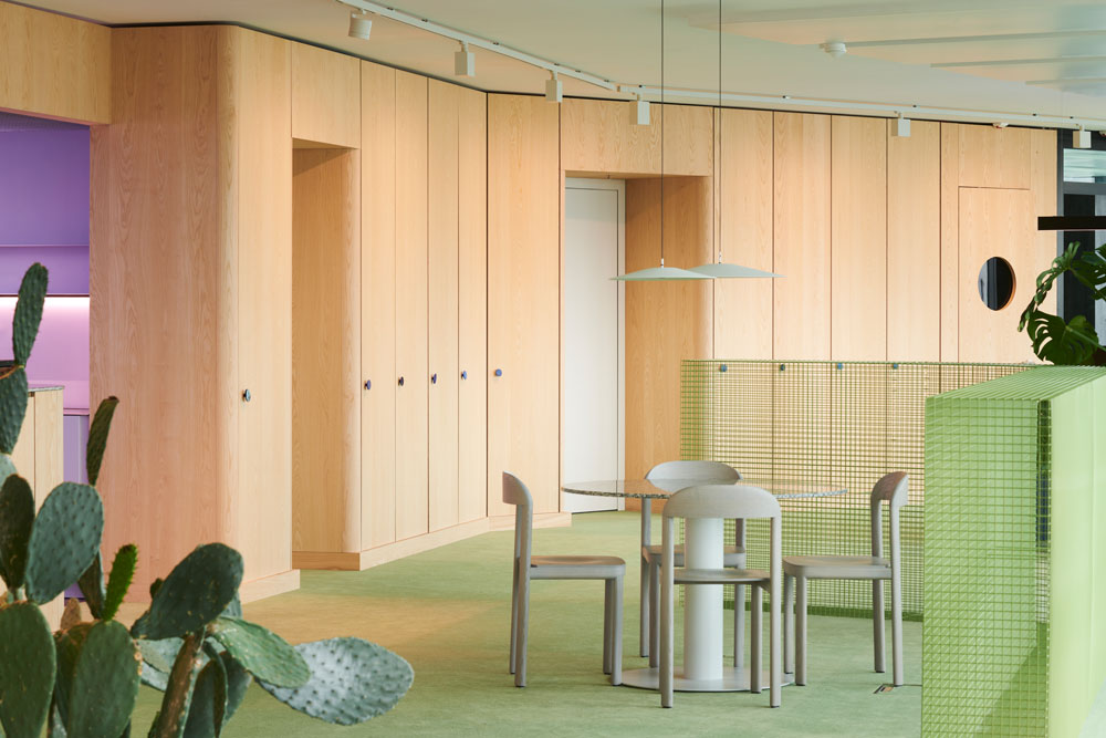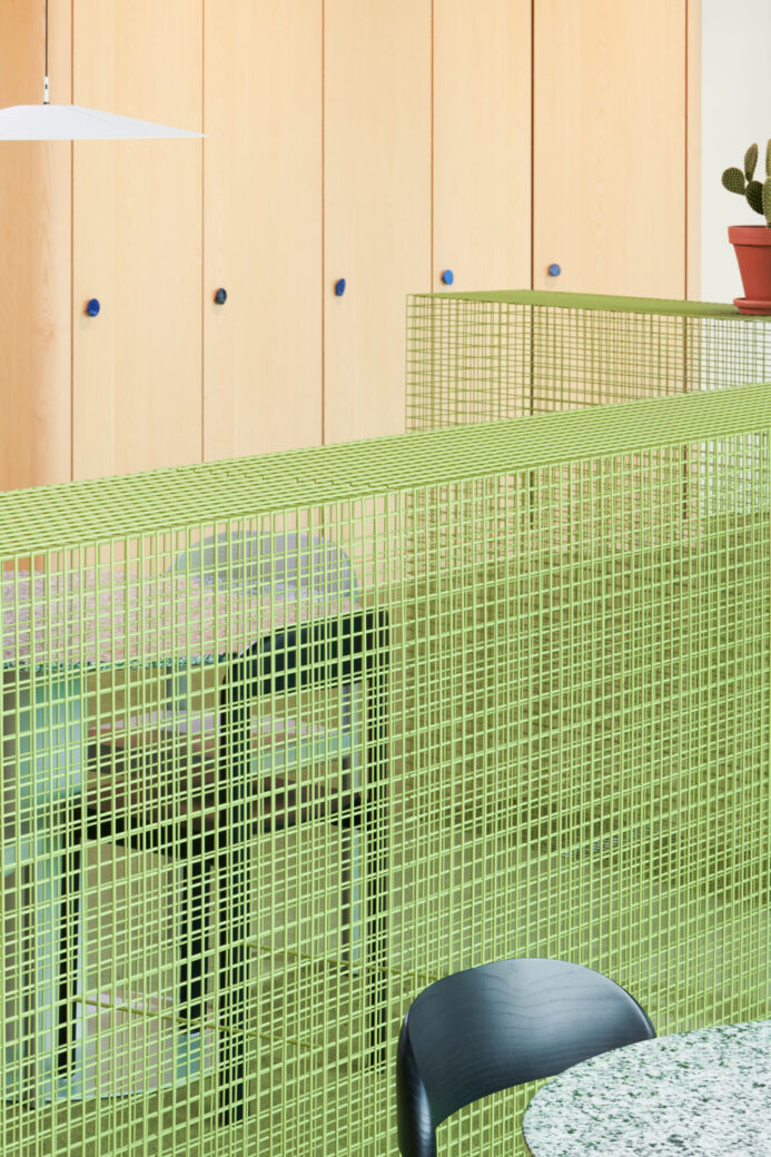 Visitors are first welcomed by The Relaxation Zone, a space full of vibrant colours, rounded shapes and inviting textures. Here, employees and guests alike can make use of a lounge furnished with a bevy of primary-coloured furniture including grey boucle armchairs, cobalt blue floor lamps and low, rounded coffee tables in a rich wood grain. Zoned once again by colour, the open-plan configuration leads straight from the lounge into a shared bistro-cum-kitchen, distinguished by its floor-to-ceiling lilac cabinetry and countertops illuminated by in-built task lighting. These two spaces are divided by mid-height mesh partitions made with green metal, which subtly organise the open floorplan without blocking the flow of natural light in a compact workspace.
