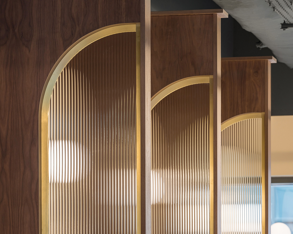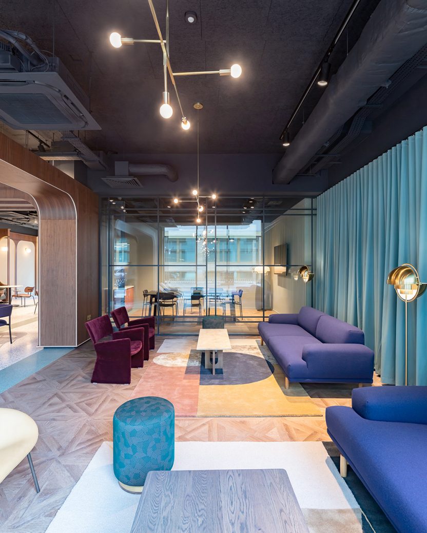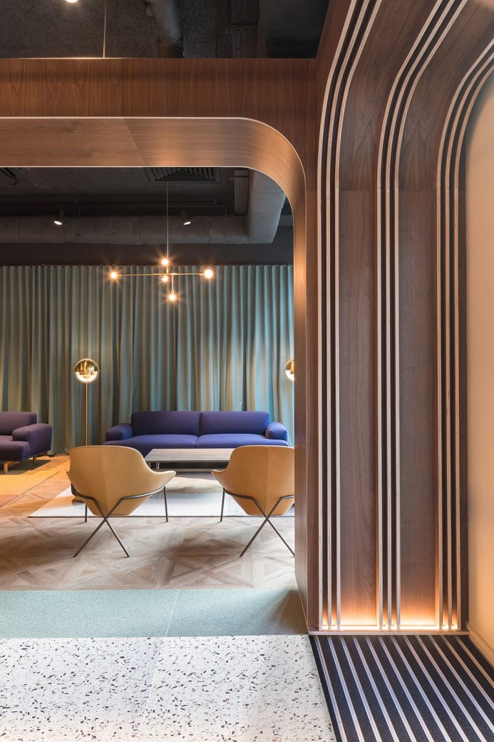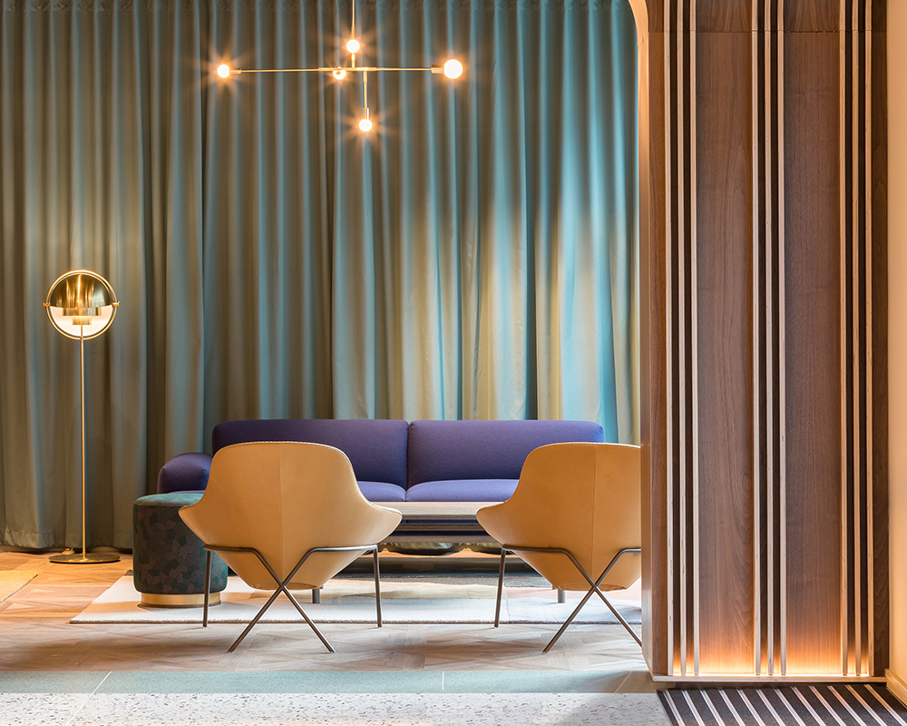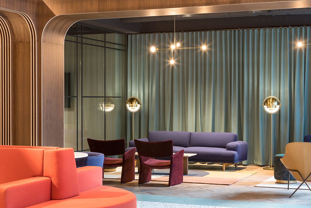 A reception desk, upholstered benches, lounge spaces with curtain backdrops (another nod to the theatrical) and ribbed glass screens, which smartly create seating booths, are complemented by a selection of mid-century inspired furniture in bright fabrics, walnut and stone. The ceiling and services are painted out in black, with simple track lighting inspired by theatrical lighting rigs and a selection of elegant brass pendant lights highlighting key set pieces within the space.