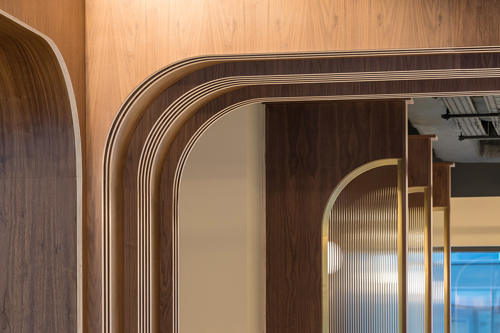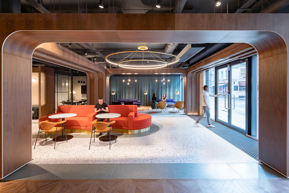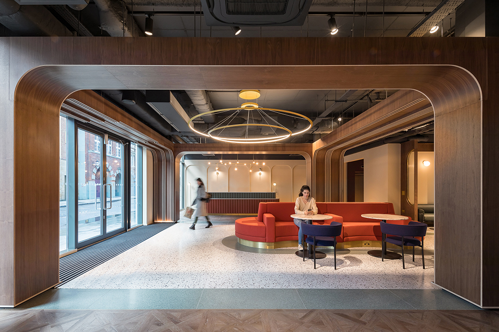 Guests arriving at Chapter Old Street – a dramatic new co-living space for students on the edge of the City of London – are immediately greeted by a theatrical entrance hall, which Tigg + Coll saw as a reinterpretation of the classic proscenium stage: frames of curved walnut arches sit against a decorative terrazzo floor, revealing new ‘sets’ as you make your way through the space.