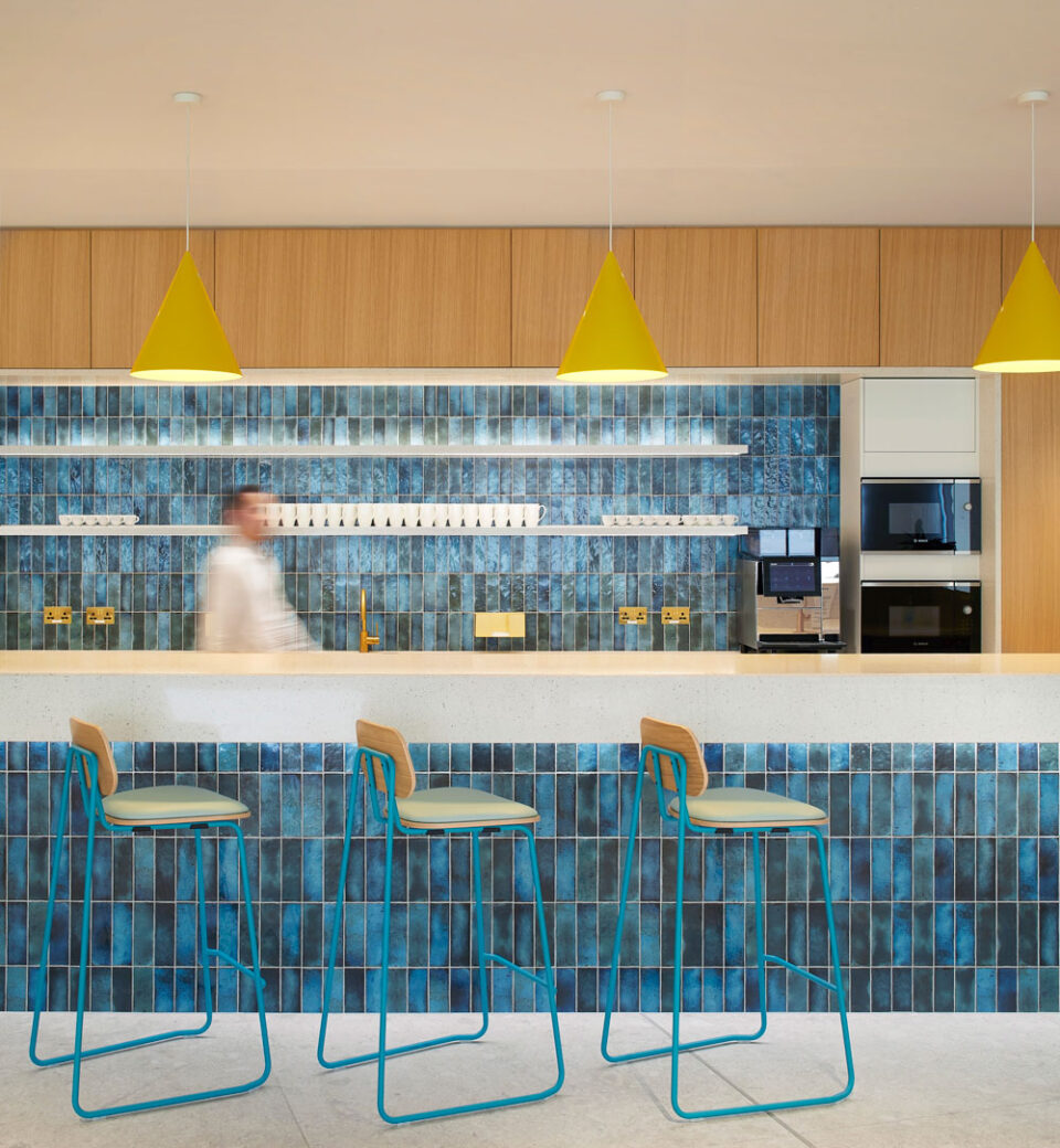 To blur the boundaries and promote transparency between Aviva’s clients and colleagues, the first level has been designed to host a series of connected spaces. The client suite sits alongside the colleague hub with a variety of informal seating and a large kitchenette, providing a relaxed and casual space for interaction between colleagues or clients, and a new central staircase encourages chance encounters; opening onto activated collaboration zones and refreshment areas which wrap around the light-filled atrium.