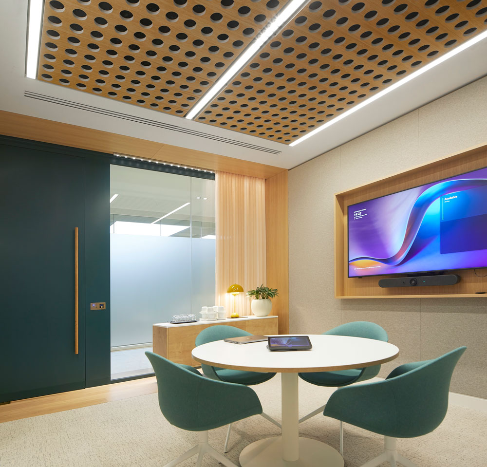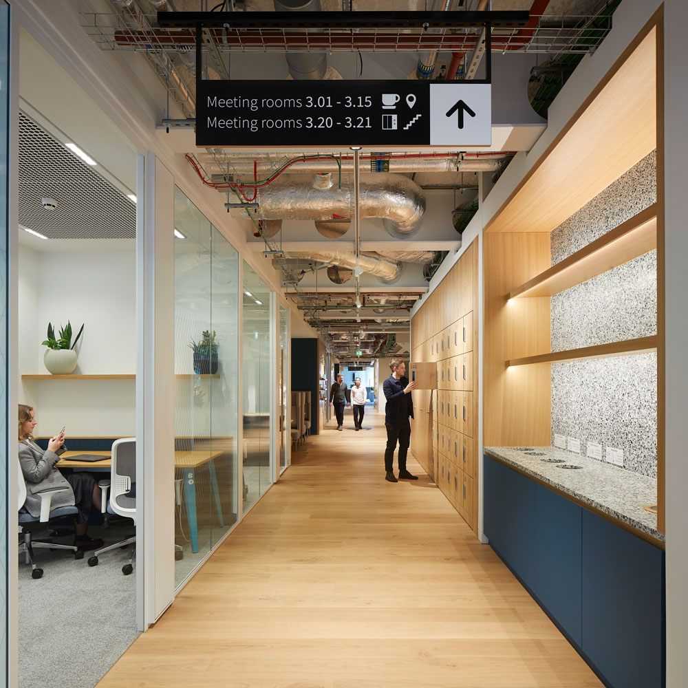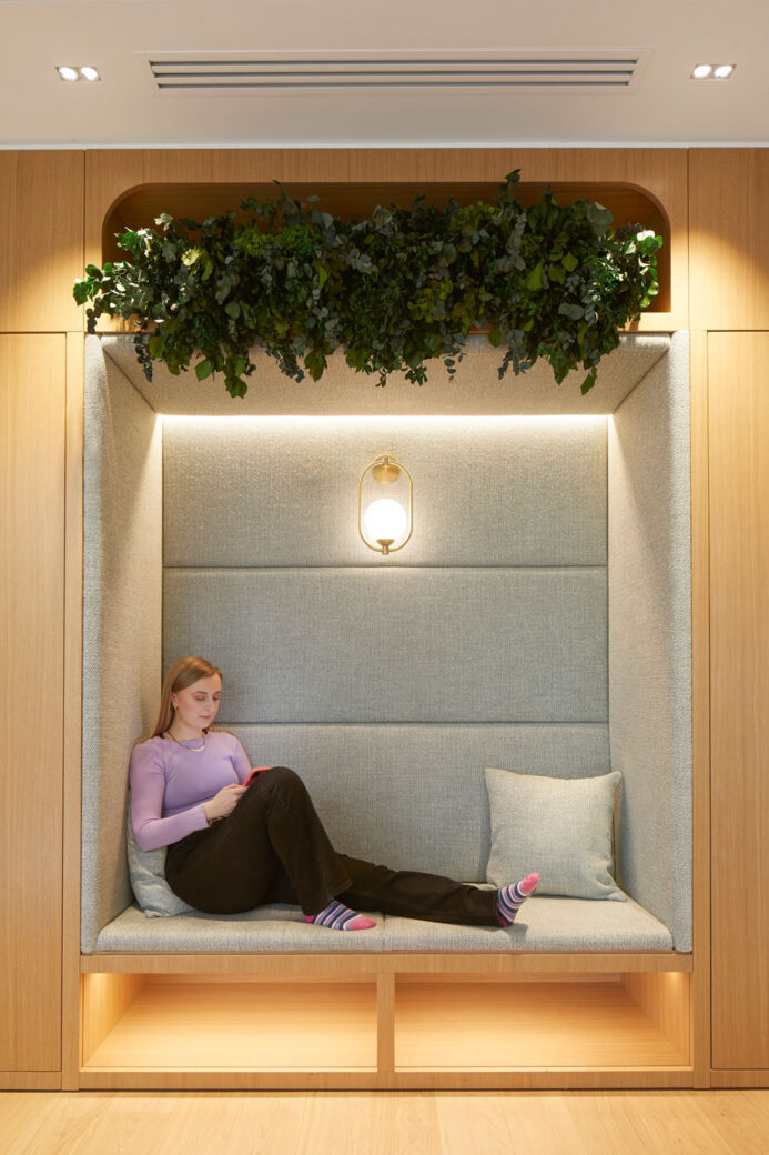 A neutral, warm colour palette with a mix of timber flooring, carpet and tiles is employed throughout, and a series of wellbeing rooms – meditative spaces, a multi-faith prayer room, a first aid treatment room as well as a designated space for parents – underline the company’s commitment to wellbeing.