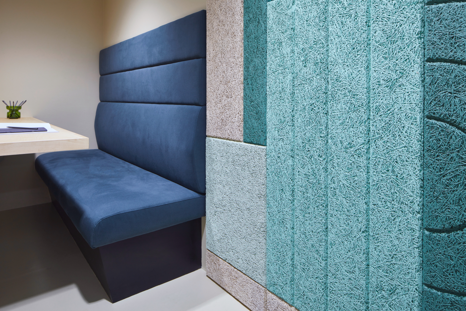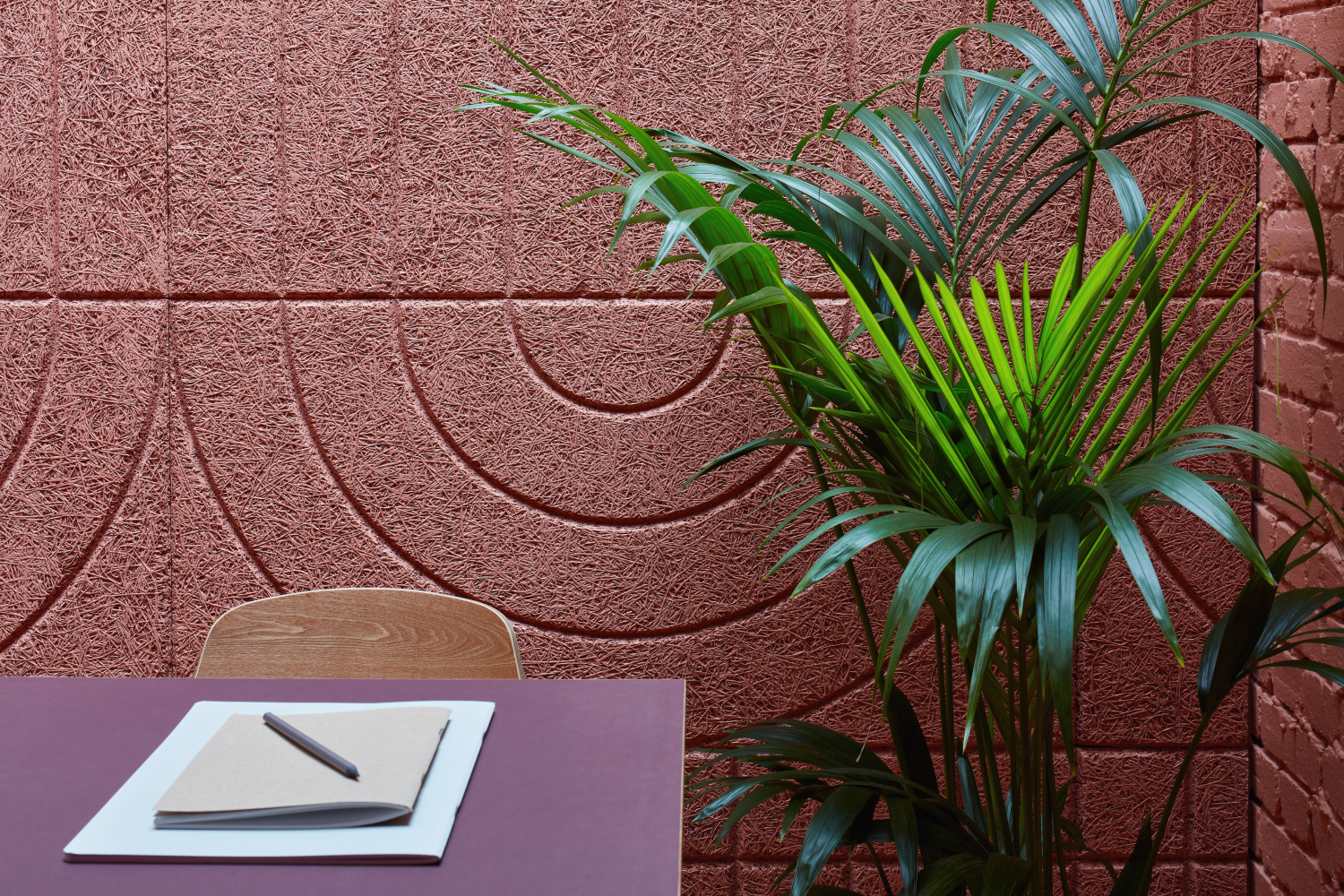 Areas for focused work have also been implemented in the fit-out with a purpose-built ‘Zoom room’, workshop and meeting room. Inside the ‘Zoom room’, blue and green cladding partners BAUX acoustic panels. In the meeting room, copper blush BAUX panels accentuate a double height wall, and accompany surrounding brick wall in the same colour. Chosen accessories include rich green plants, amber glassware, books and artwork in accents of mustard in deep blues. A sky light has also been inserted to draw eye-gaze upwards and bring light in.